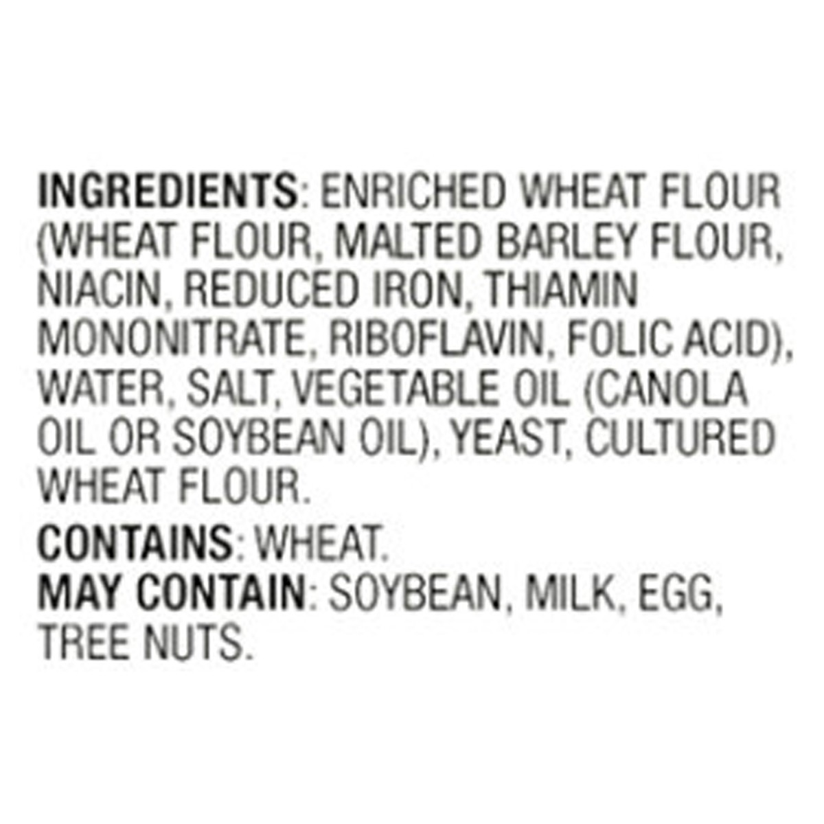 Enriched Wheat Flour (Wheat Flour, Malted Barley Flour, Niacin, Reduced Iron, Thiamin Mononitrate, Riboflavin, Folic Acid), Water, Salt, Vegetable Oil (Canola Oil or Soybean Oil), Yeast, Cultured Whea…