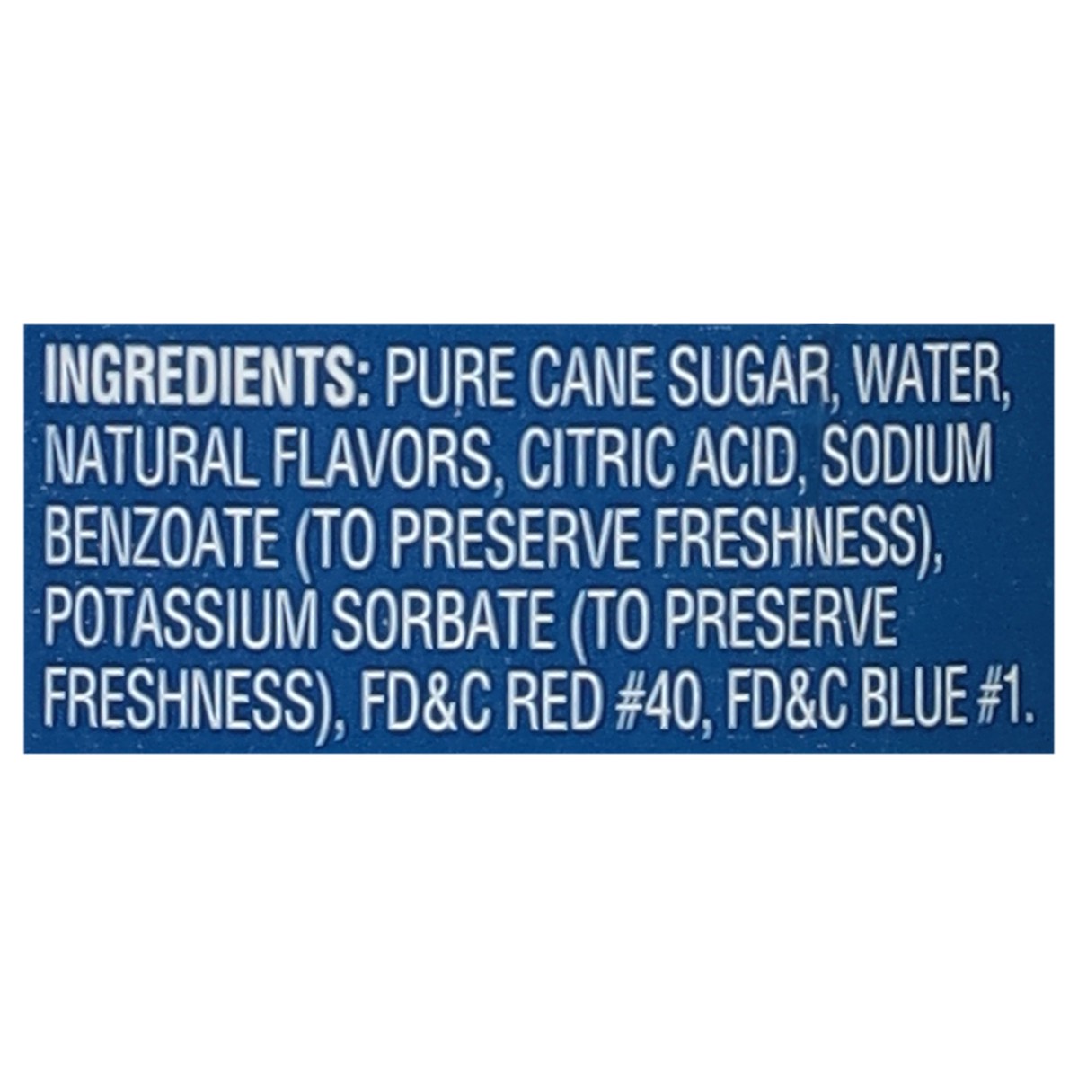Pure Cane Sugar, Water, Natural Flavors, Citric Acid, Sodium Benzoate (to Preserve Freshness), Potassium Sorbate (to Preserve Freshness), FD&C Red 40, FD&C Blue 1.