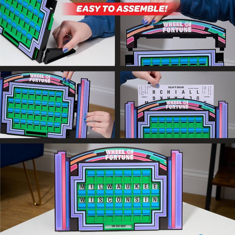 - Includes: Game wheel, puzzle board, 3 puzzle board frame pieces, 2 puzzle board feet, 25 puzzle cards (100 puzzles), 75 play money bills, dry-erase letter tracker, dry-erase marker, and instructions.