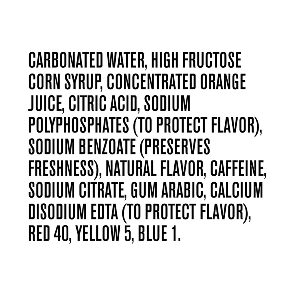 Carbonated Water, High Fructose Corn Syrup, Concentrated Orange Juice, Citric Acid, Sodium Polyphosphates (to Protect Flavor), Sodium Benzoate (Preserves Freshness), Natural Flavor, Caffeine, Sodium C…