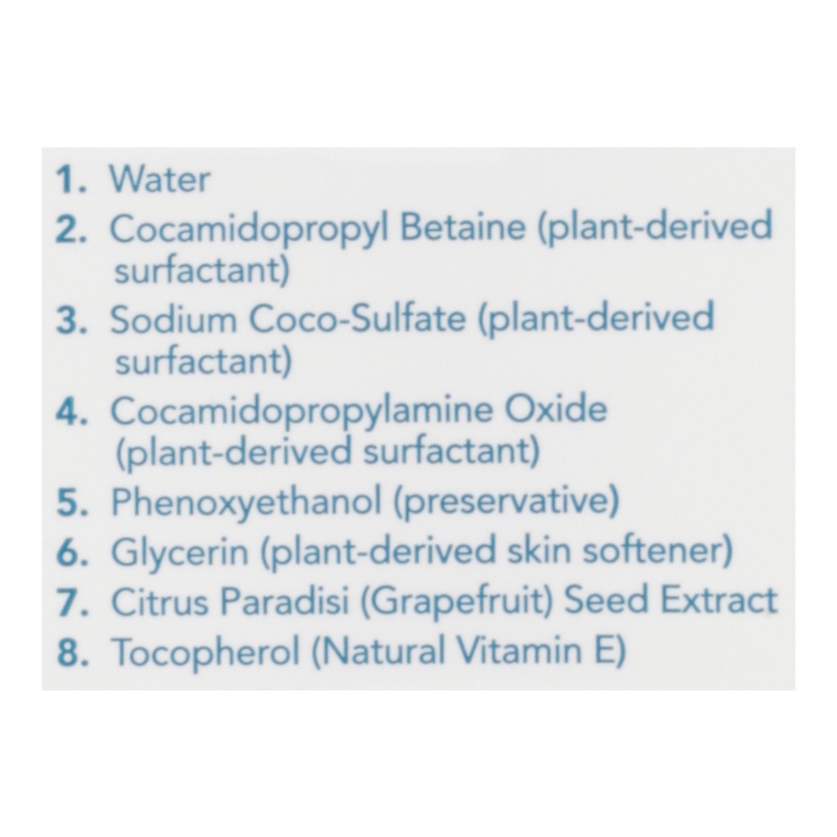 Only 8 Ingredients 1, Water 2, Cocamidopropyl Betaine (Plant-Derived Surfactant) 3, Sodium Coco-Sulfate (Plant-Derived Surfactant) 4, Cocamidopropylamine Oxide (Plant-Derived Surfactant) 5, Phenoxyeth…