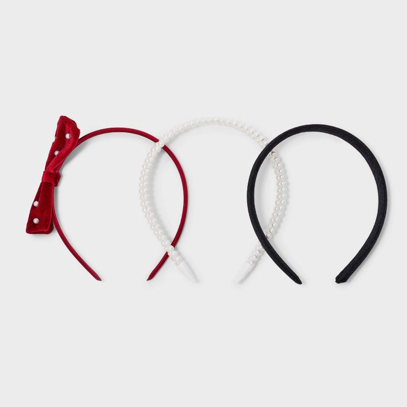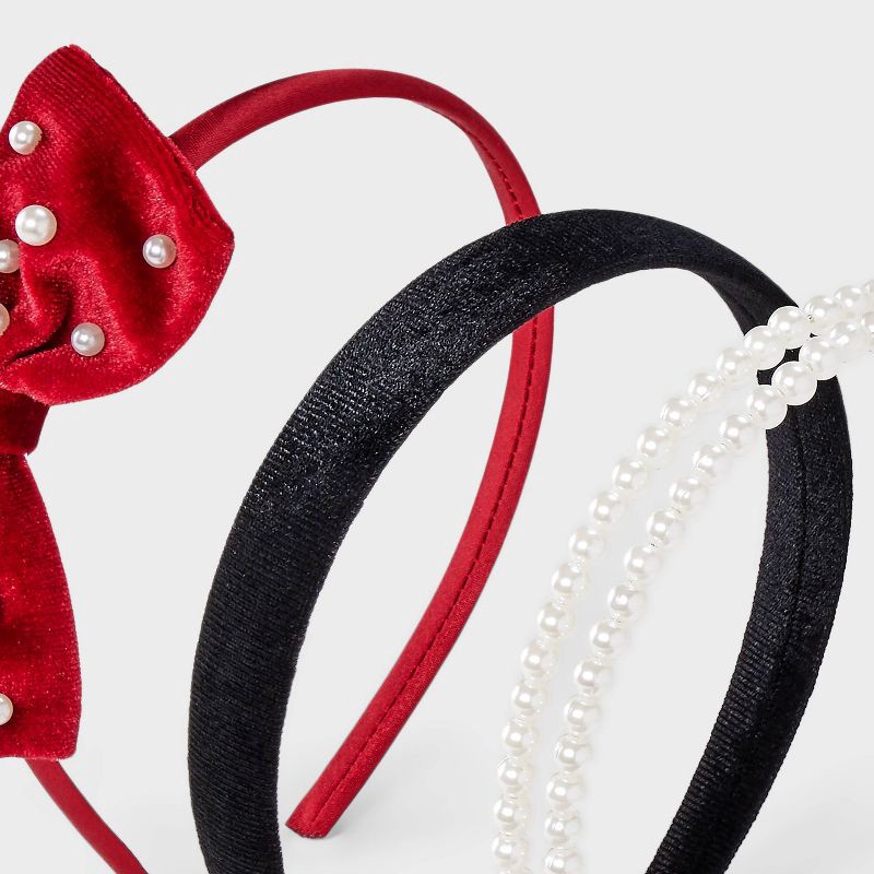 The Girls' 3pk Bow and Pearls Headband Set by Cat & Jack™ Red/Black offers a perfect mix of elegance and charm. With three unique designs to choose from, this set provides versatile styling options fo…