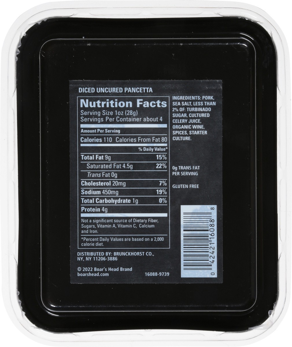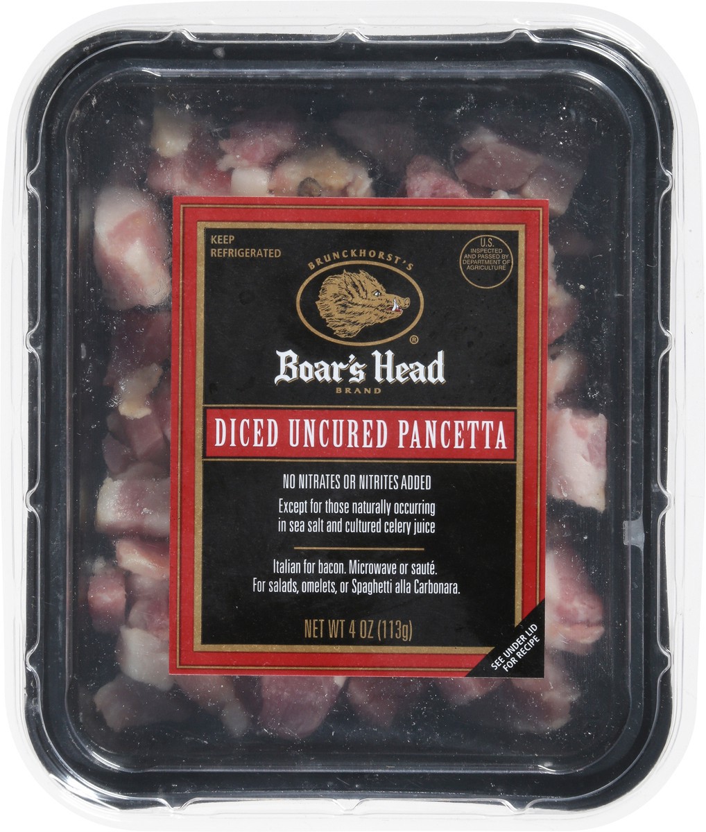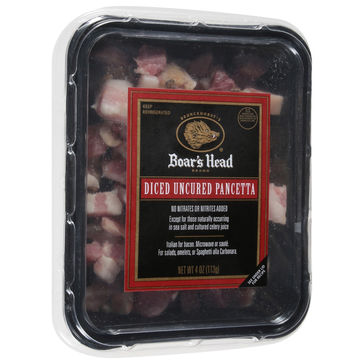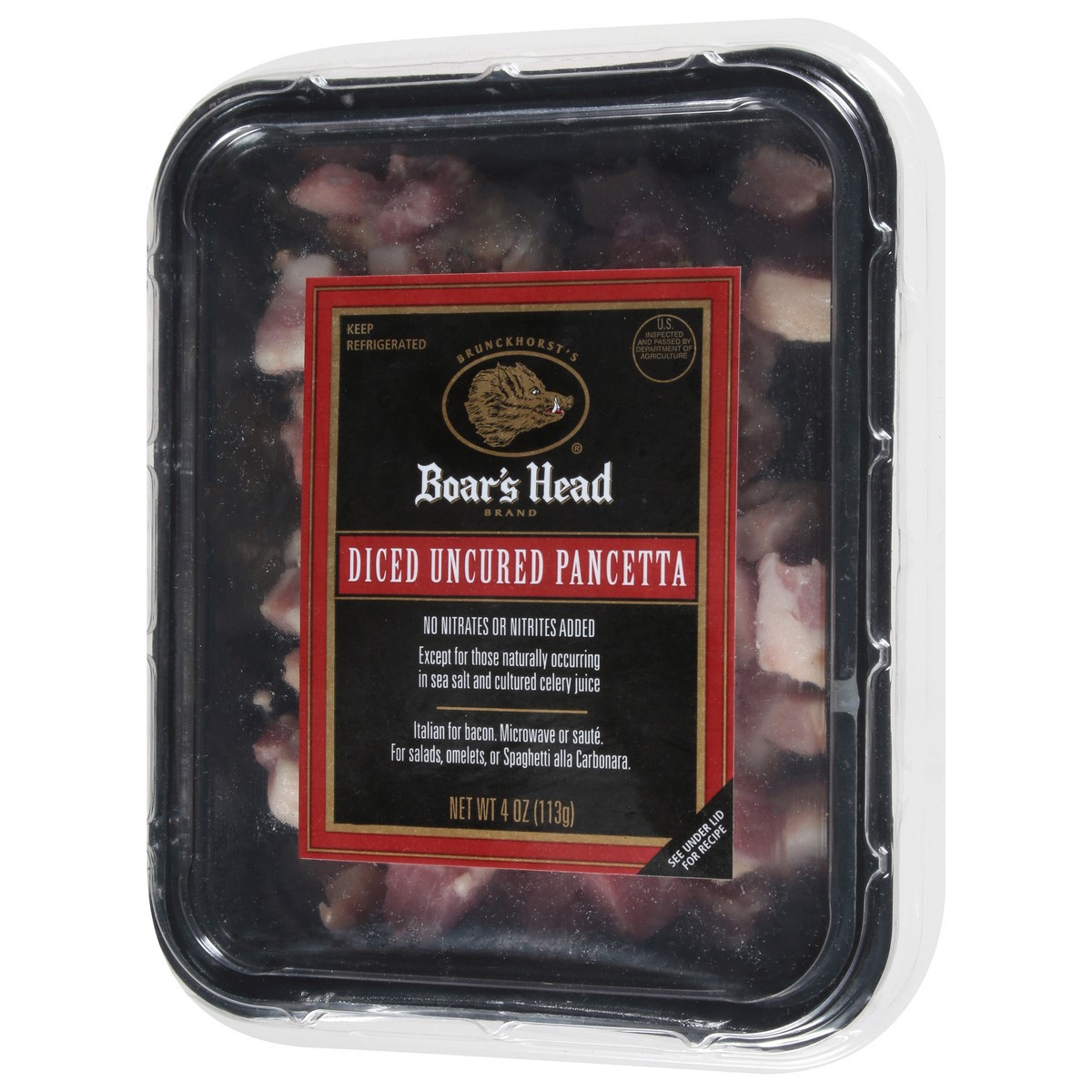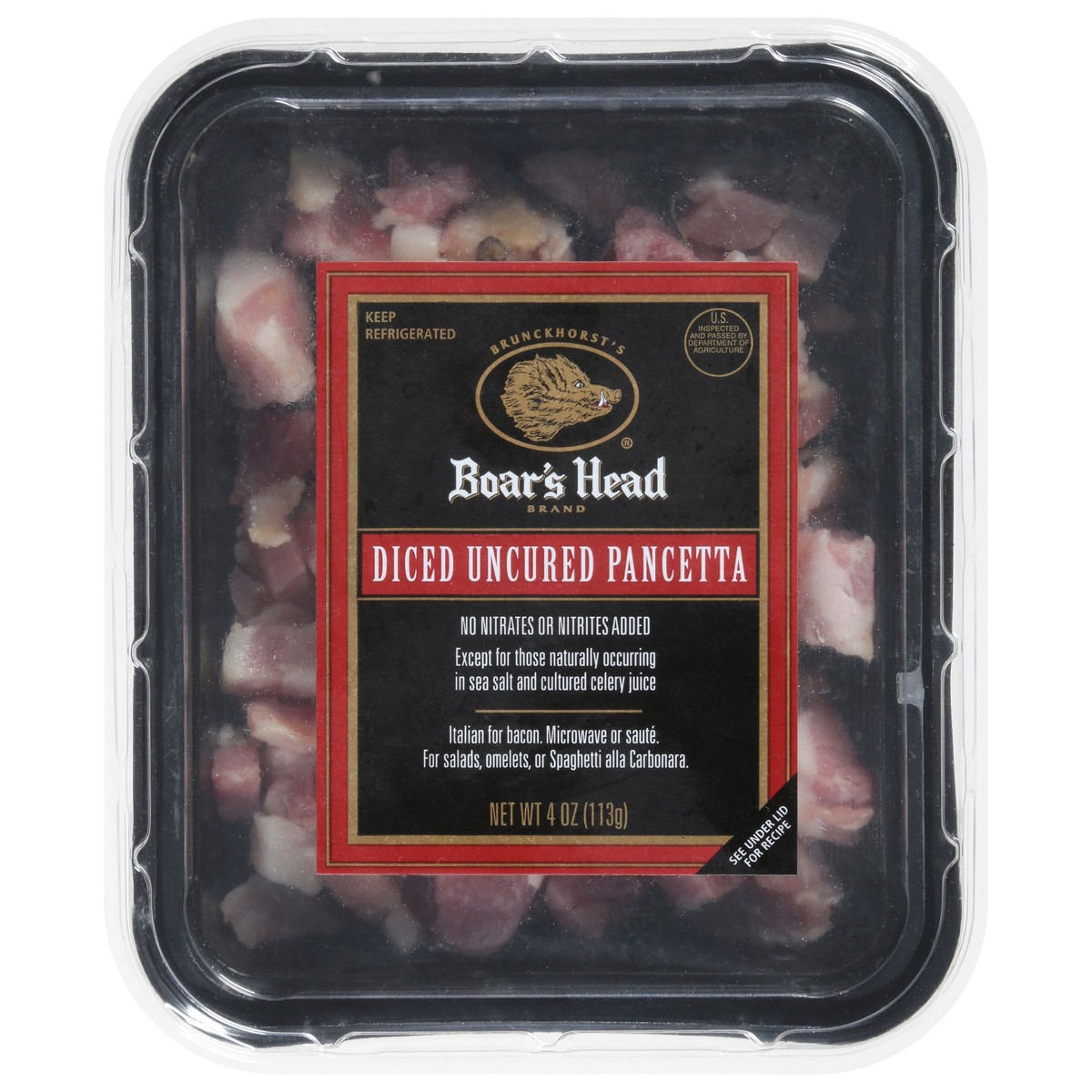 An Italian-style cured specialty that's diced for convenience, Boar's Head Uncured Pancetta is hand-rubbed with salt, peppercorns and aromatic spices then tightly rolled and dry cured.