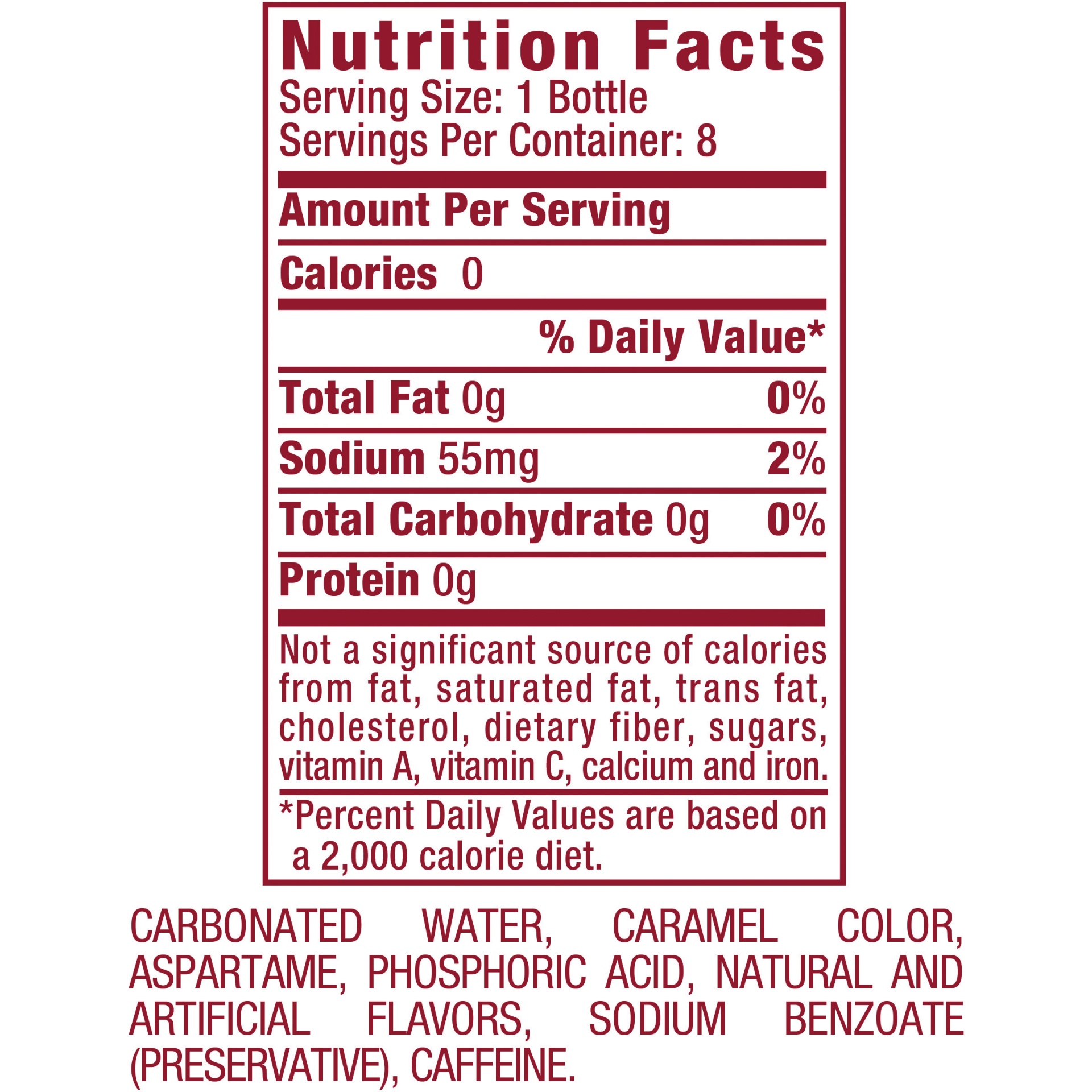 Carbonated Water, Caramel Color, Aspartame, Phosphoric Acid, Natural and Artificial Flavors, Sodium Benzoate (Preservative), Caffeine.