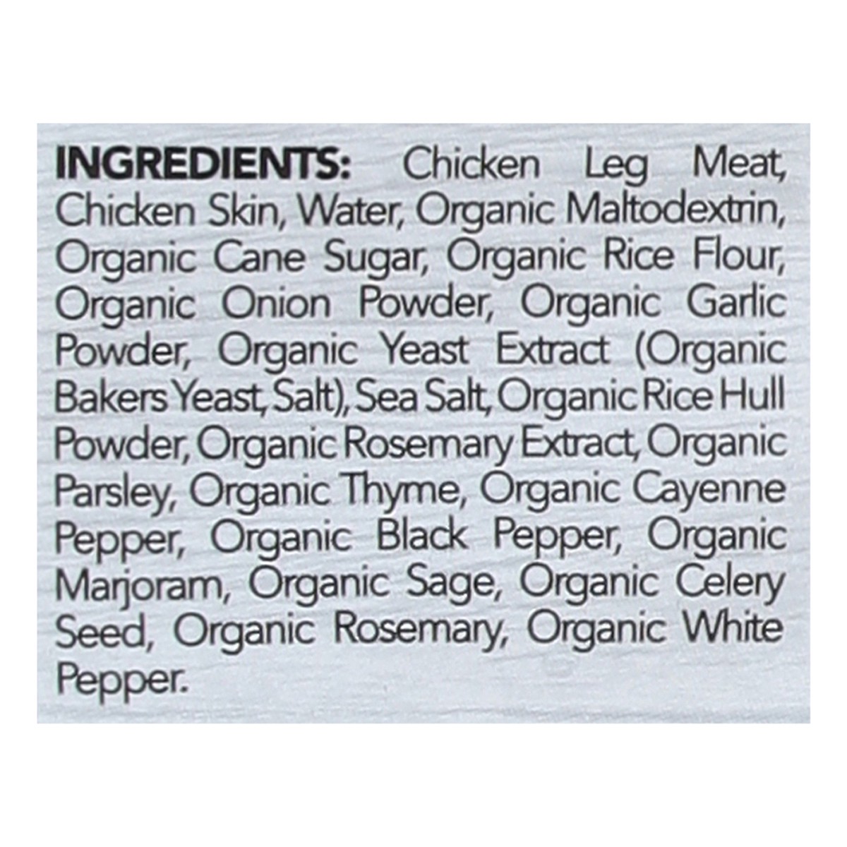 Chicken Leg Meat, Chicken Skin, Water, Organic Maltodextrin, Organic Cane Sugar, Organic Rice Flour, Organic Onion Powder, Organic Garlic Powder, Organic Yeast Extract (Organic Bakers Yeast, Salt), Se…