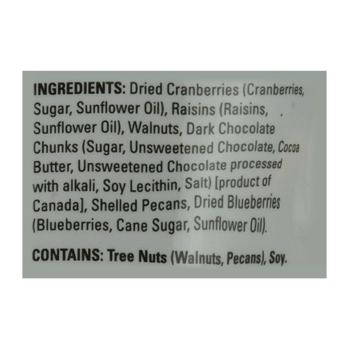 Dried Cranberries (Cranberries Sugar, Sunflower Oil), Raisins (Raisins, Sunflower Oil), Walnuts, Dark Chose, Chunks (Sugar, Unsweetened Cocoa Butter, Unsweetened Chocolate processed with Alkali, Soy L…