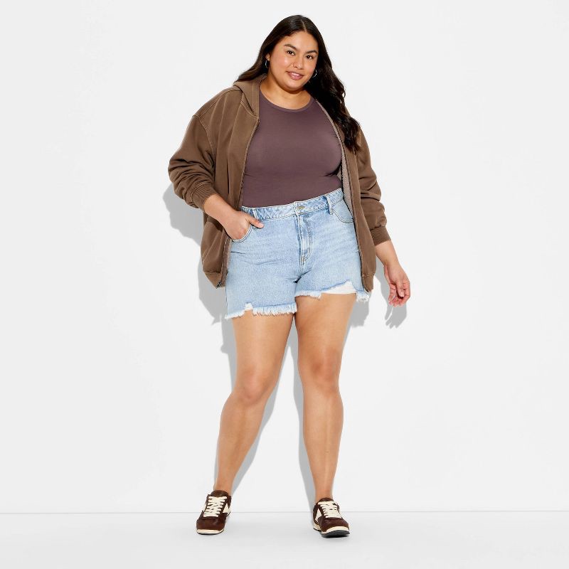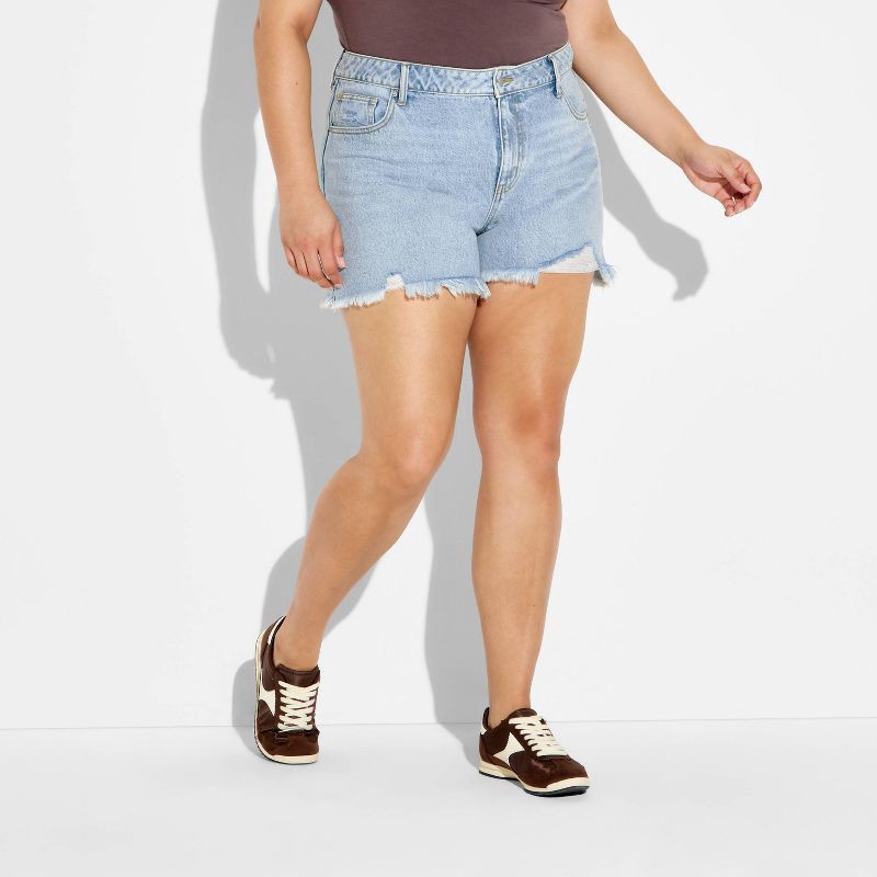 Denim cutoff mid-rise shorts from Wild Fable™ with raw, frayed hems. Crafted from midweight denim fabric blend of cotton and recycled cotton, viscose and lyocell for flexible comfort. Tailored in a re…