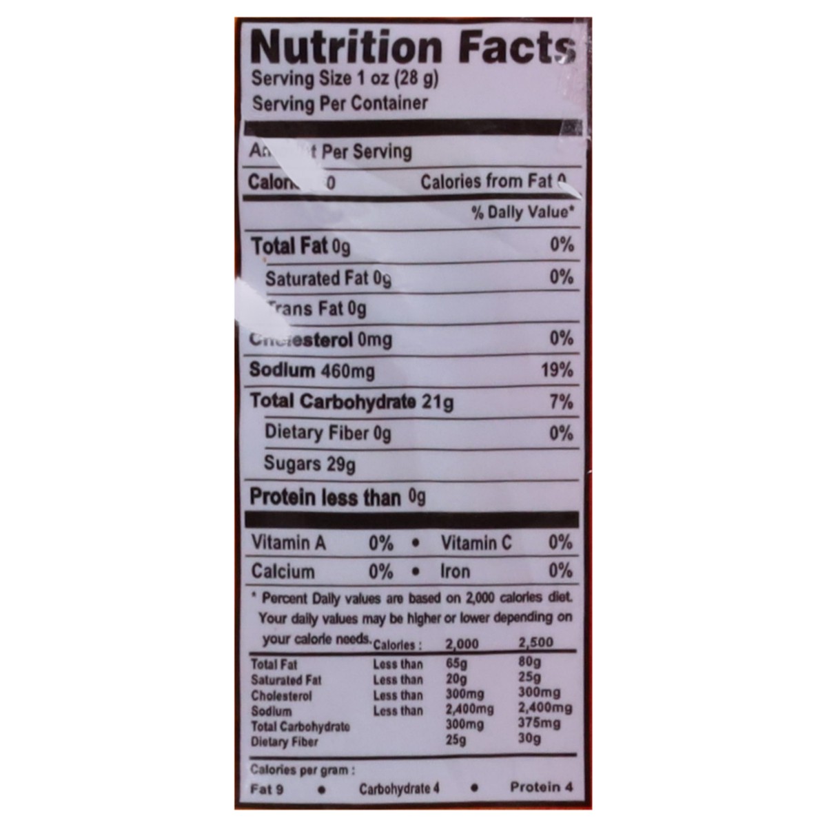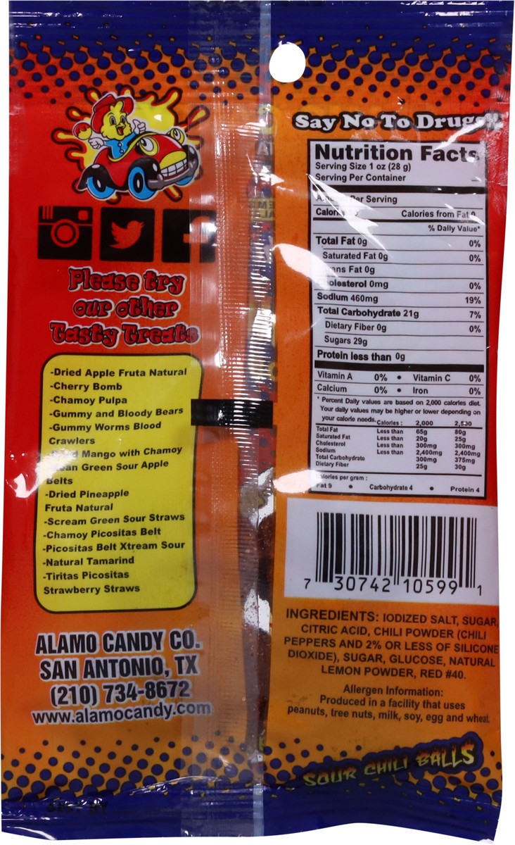 Iodized Salt, Sugar, Citric Acid, Chili Powder (Chili Peppers and 2% or Less of Silicone Dioxide), Sugar, Glucose, Natural Lemon Powder, Red #40.