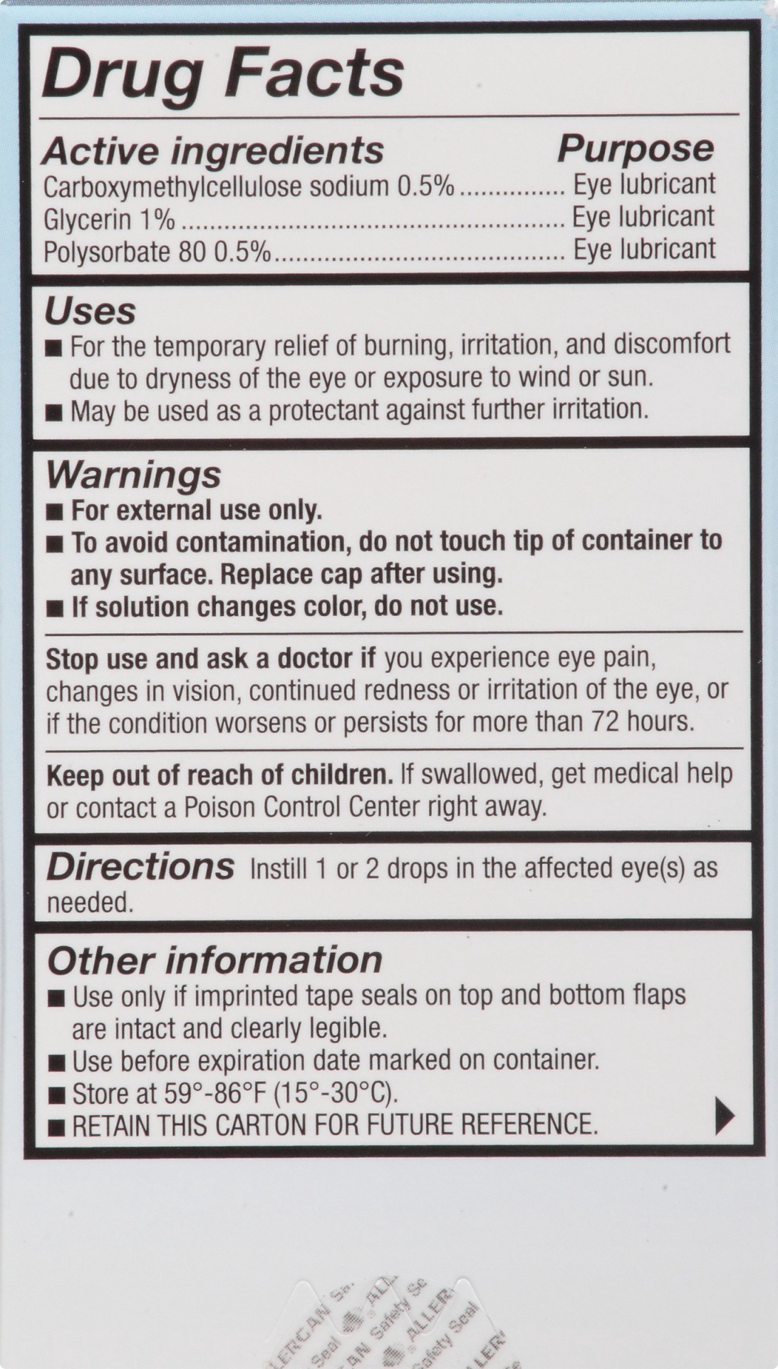 Active: Carboxymethylcellulose Sodium 0.5%...Purpose: Eye Lubricant, Glycerin 1%...Purpose: Eye Lubricant, Polysorbate 80 0.5%...Purpose: Eye Lubricant. Inactive: Boric Acid, Castor Oil, Carbomer Copo…