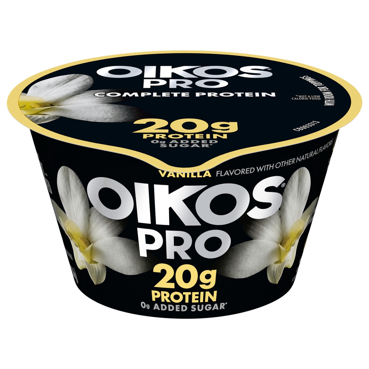 Go Pro with Oikos Pro Vanilla Yogurt-Cultured Ultra-Filtered Milk Product, the spoonable high protein snack with more of what you want, and less of what you don’t. Every serving contains 0g added suga…