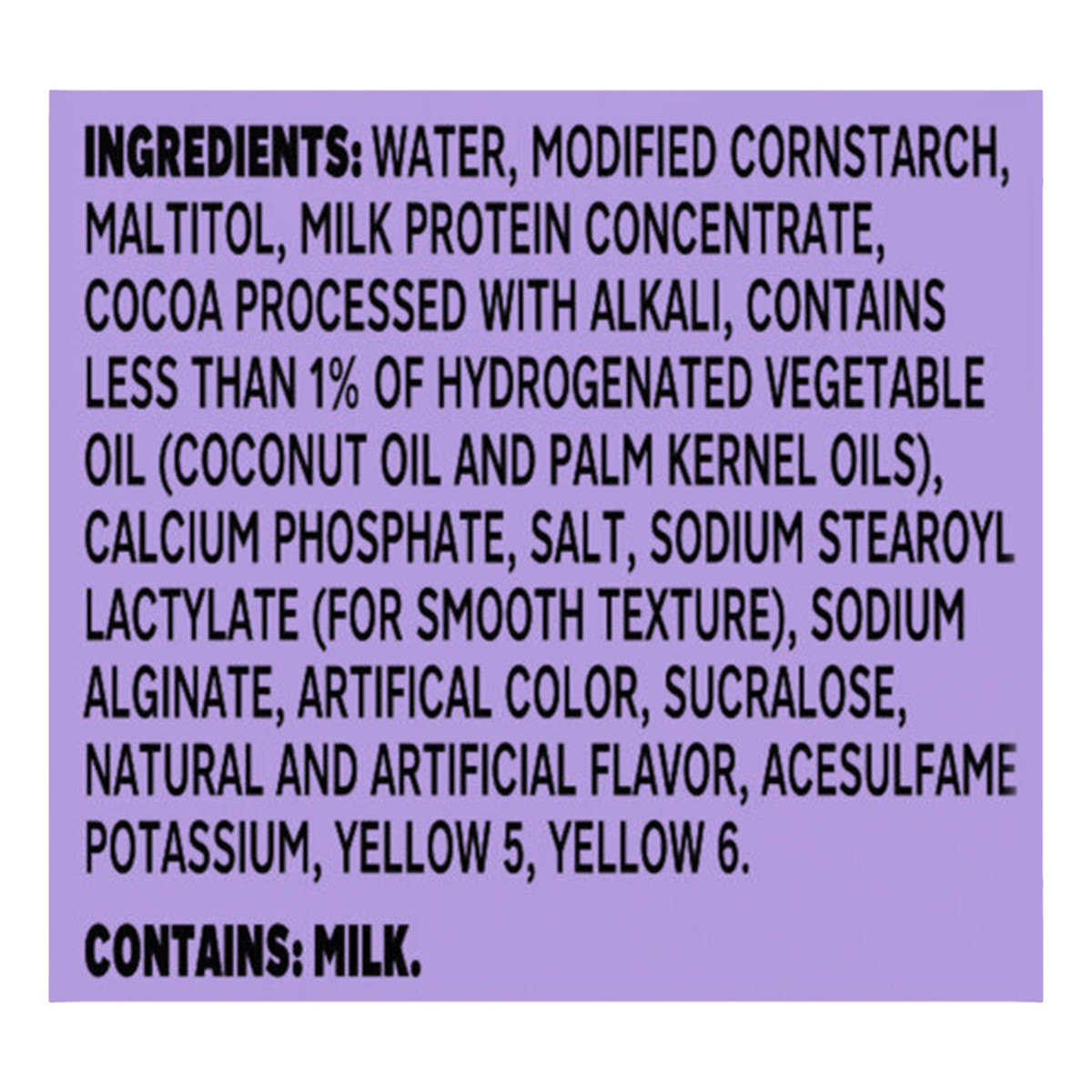 Water, Modified Cornstarch, Maltitol, Milk Protein Concentrate, Cocoa Processed with Alkali, Contains Less than 1% of Hydrogenated Vegetable Oil (Coconut Oil and Palm Kernel Oils), Calcium Phosphate, …