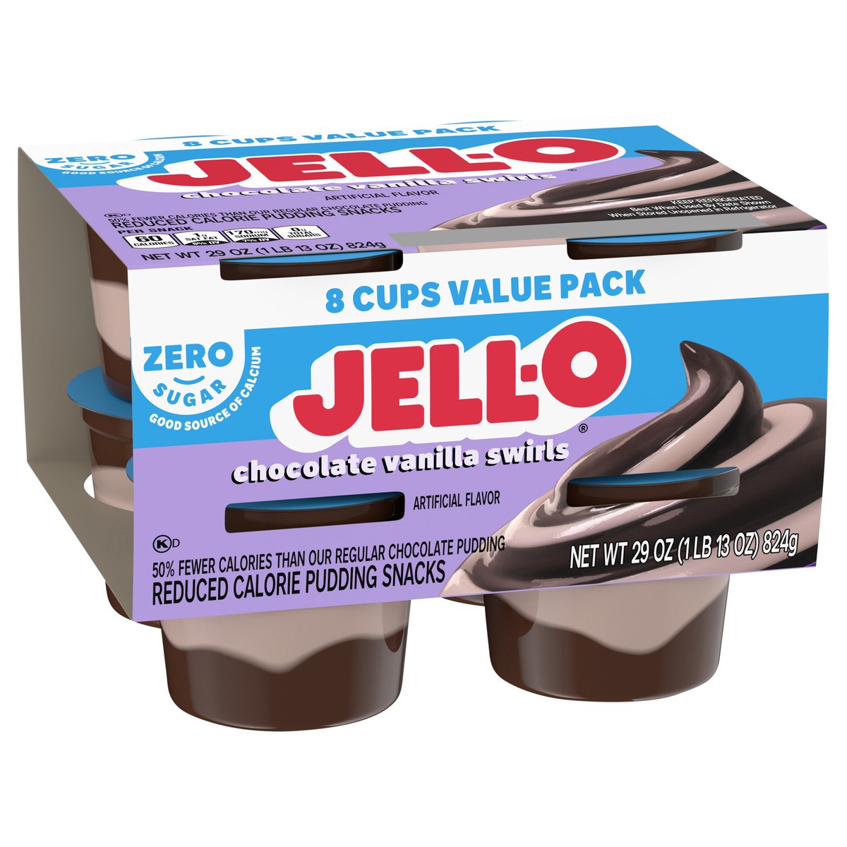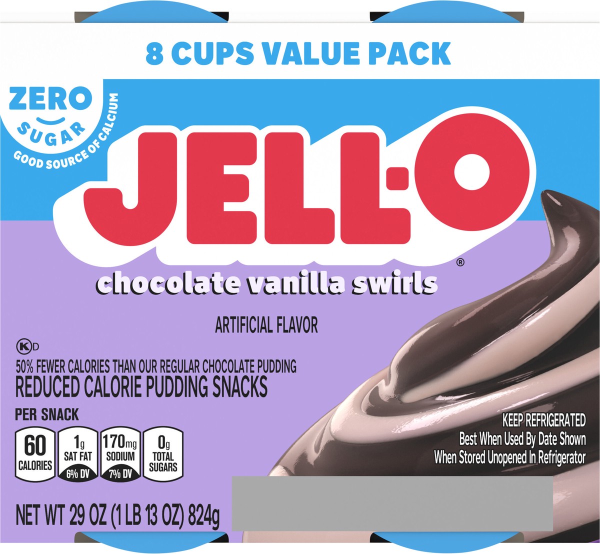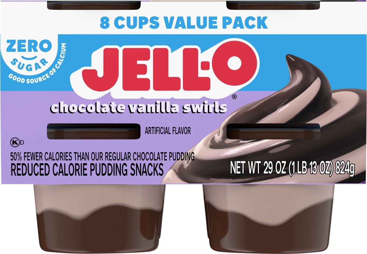 Snack happy. Jell-O Zero Sugar Chocolate Vanilla Swirls Artificially Flavored Pudding Cups deliver the great taste of Jell-O Pudding in a reduced-calorie choice. Our delicious on-the-go pudding comes …