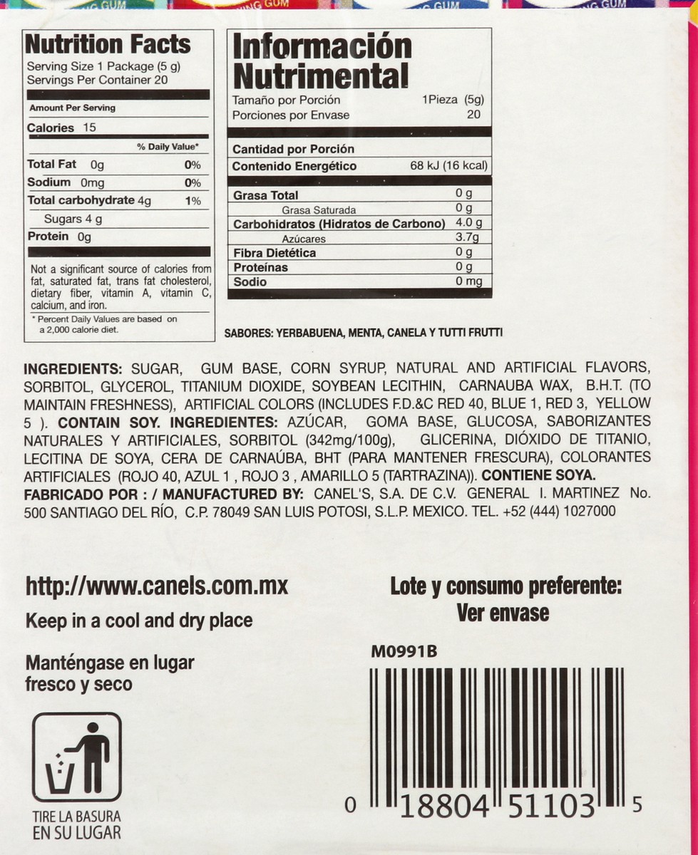 Spearmint flavor. Cinnamon flavor. Peppermint flavor. Tutti-frutti flavor. Naturally and artificially flavored. http://www.camels.com.mx. Dispose of properly.