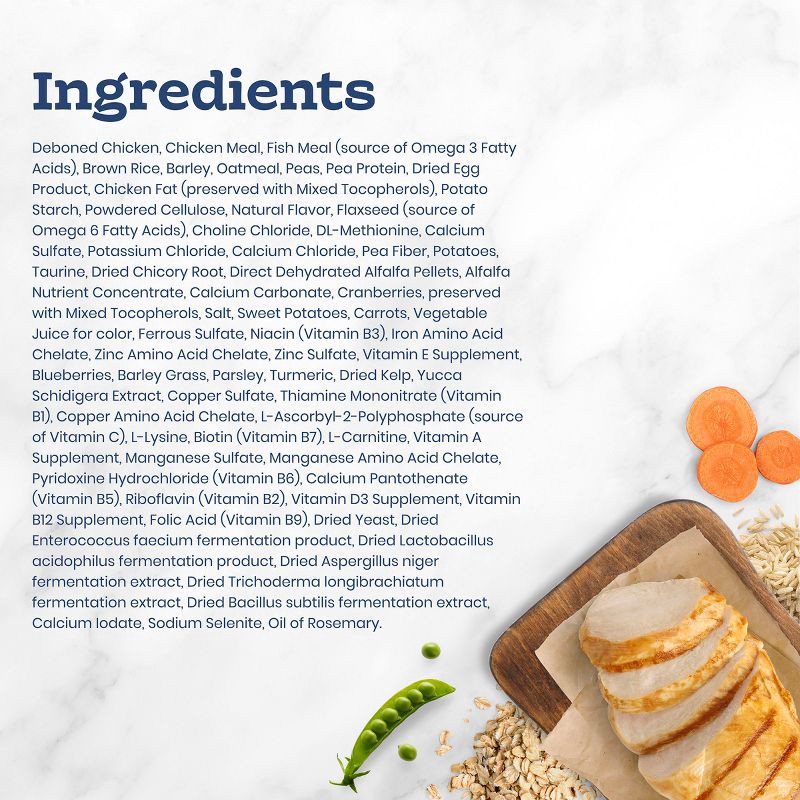 Deboned Chicken, Chicken Meal, Fish Meal (Source of Omega 3 Fatty Acids), Brown Rice, Barley, Oatmeal, Peas, Pea Protein, Dried Egg Product, Chicken Fat (Preserved with Mixed Tocopherols), Potato Star…