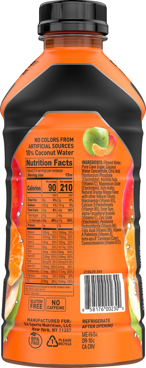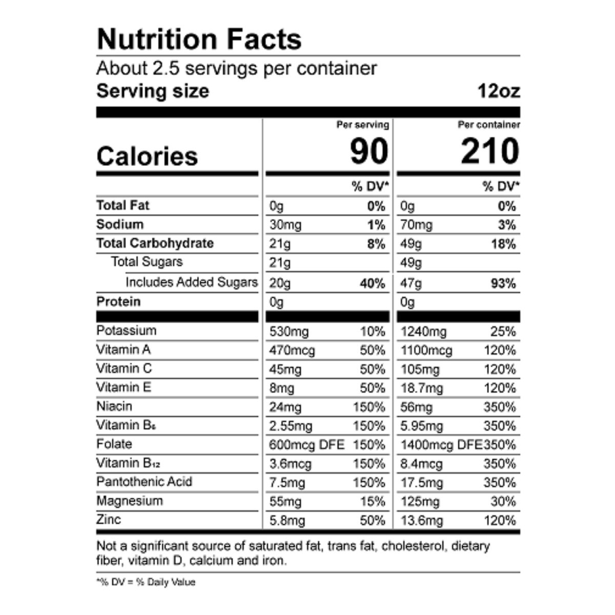 Natural flavors and sweeteners. Electrolytes: Potassium: 1,240 mg; Total Blend: 1,450 mg. Gluten free. No caffeine. Antioxidants: Vitamins A, C, & E. B Vitamins: B3, B5, B6, B9, B12. 28 oz Superior hy…