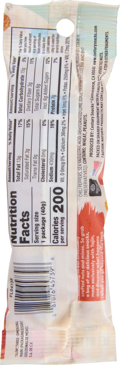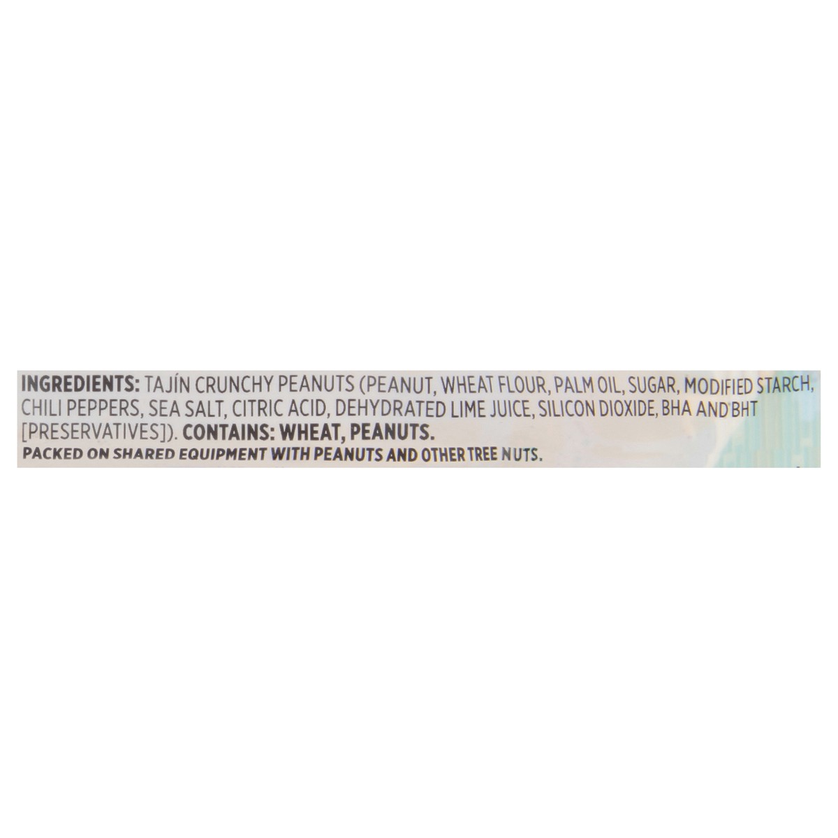Tajin Crunchy Peanuts (Peanut, Wheat Flour, Palm Oil, Sugar, Modified Starch, Chili Peppers, Sea Salt, Citric Acid, Dehydrated Lime Juice, Silicon Dioxide, BHA and BHT [Preservatives]).