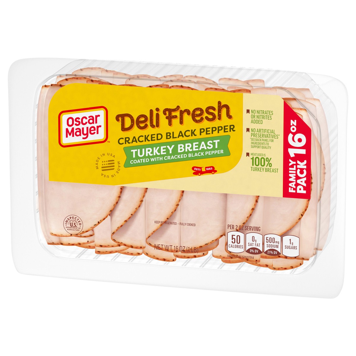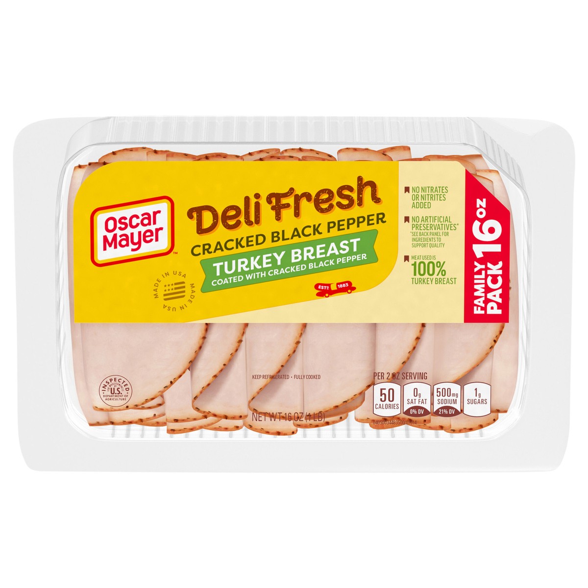 Make a delicious deli sandwich at home with Oscar Mayer Deli Fresh Cracked Black Pepper Turkey Breast Sliced Lunch Meat. Our quality turkey deli meat is 98% fat-free and made with no artificial preser…
