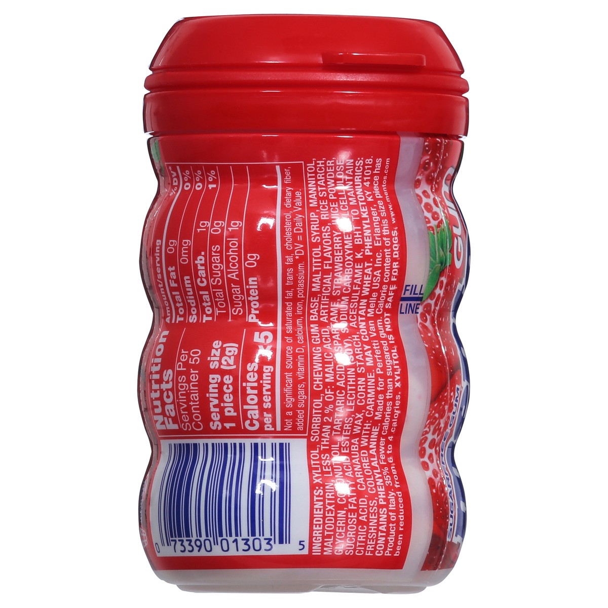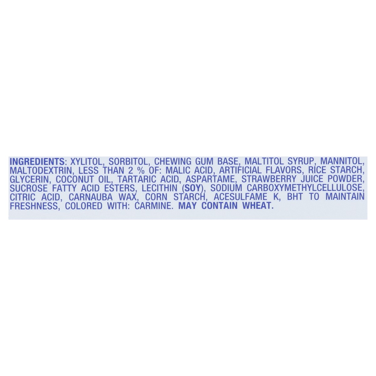 Xylitol, Sorbitol, Chewing Gum Base, Maltitol Syrup, Mannitol, Maltodextrin, Less than 2% of: Malic Acid, Artificial Flavors, Rice Starch, Glycerin, Coconut Oil, Tartaric Acid, Aspartame, Strawberry J…