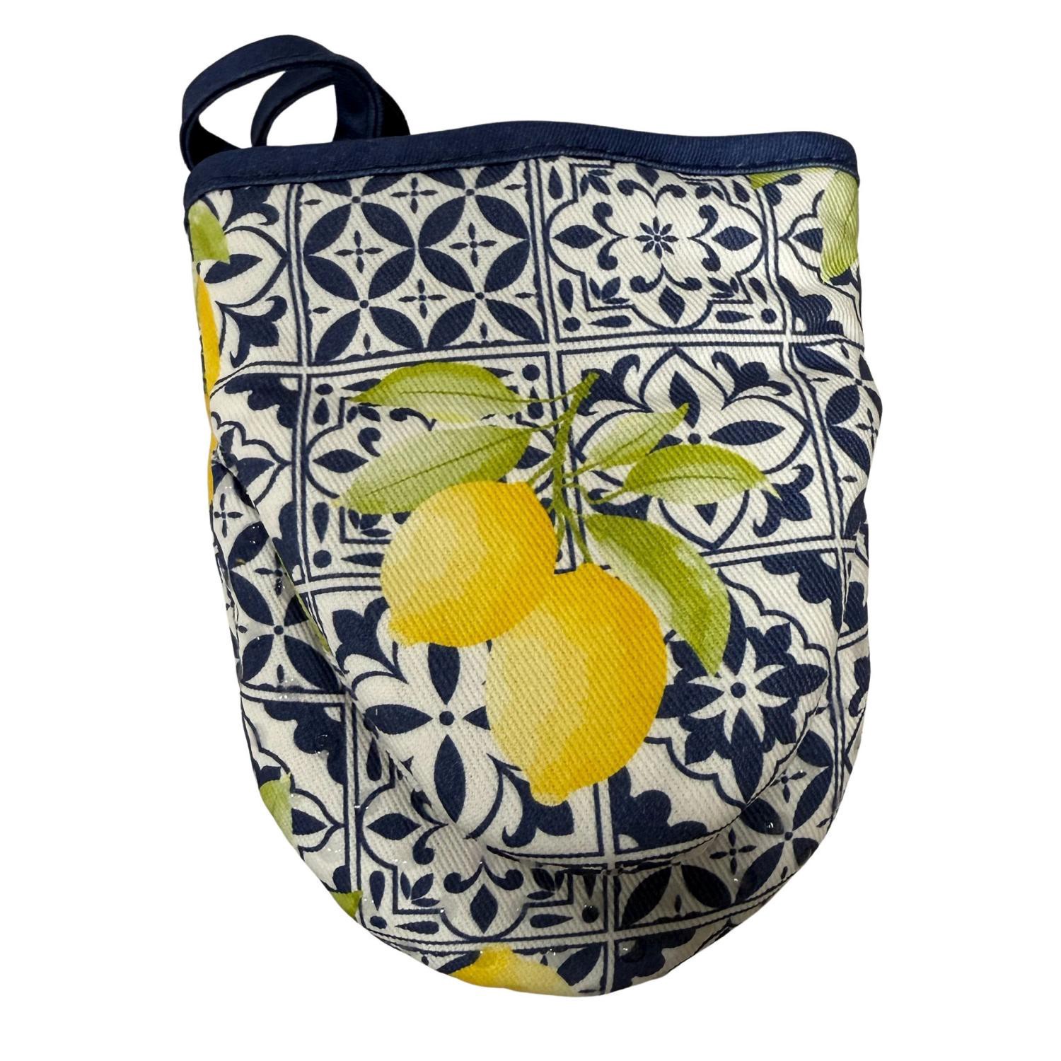 A pair of compact mini mitts with a playful lemon print. Convenient for small baking tasks and quick grabs.