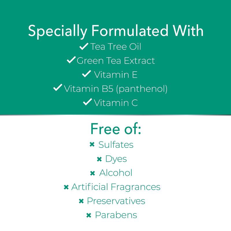 - Special formula contains tea tree oil, green tea, and vitamins E, C, and B5
