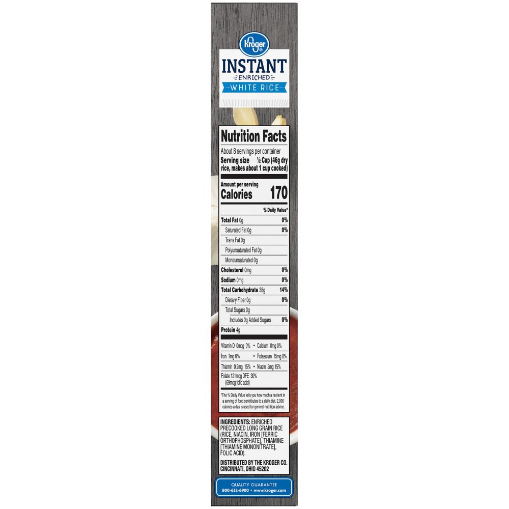 Enriched Precooked Long Grain Rice, Rice, Niacin (Niacinamide), Iron (Ferric Orthophosphate), Thiamin (Thiamin Mononitrate), Folic Acid.Original InstantReady in 5 MinutesMade in the U.S.A.Kosher