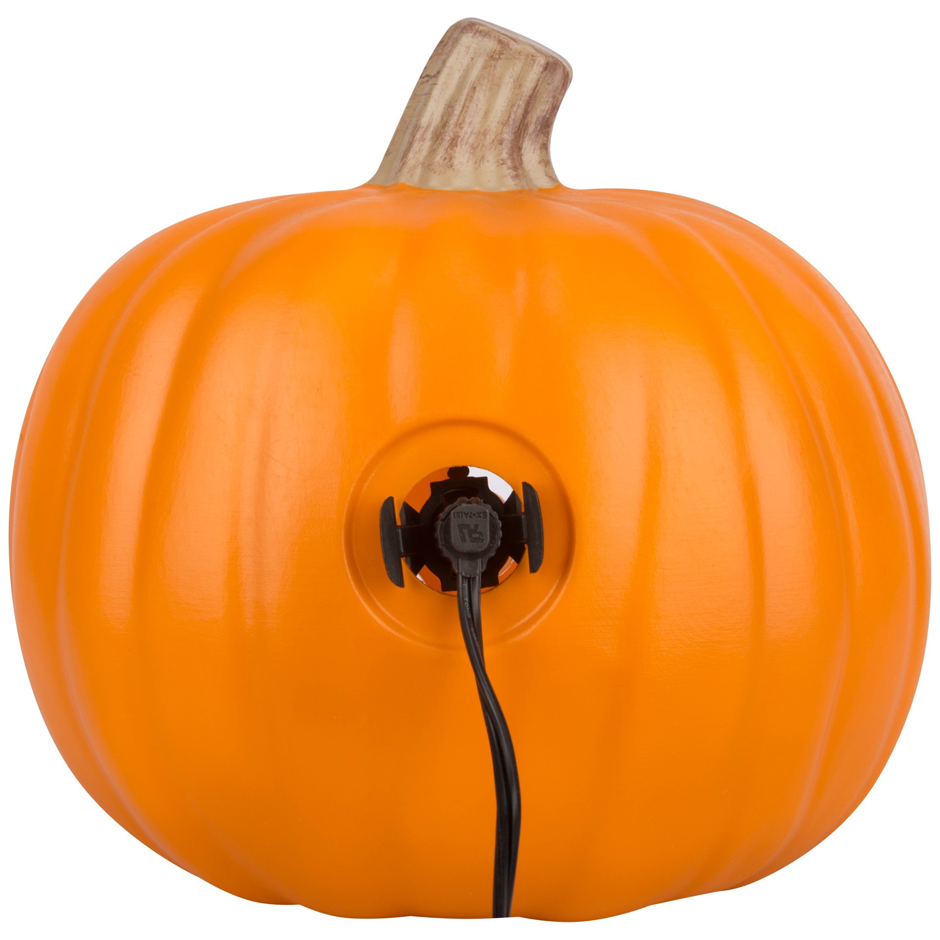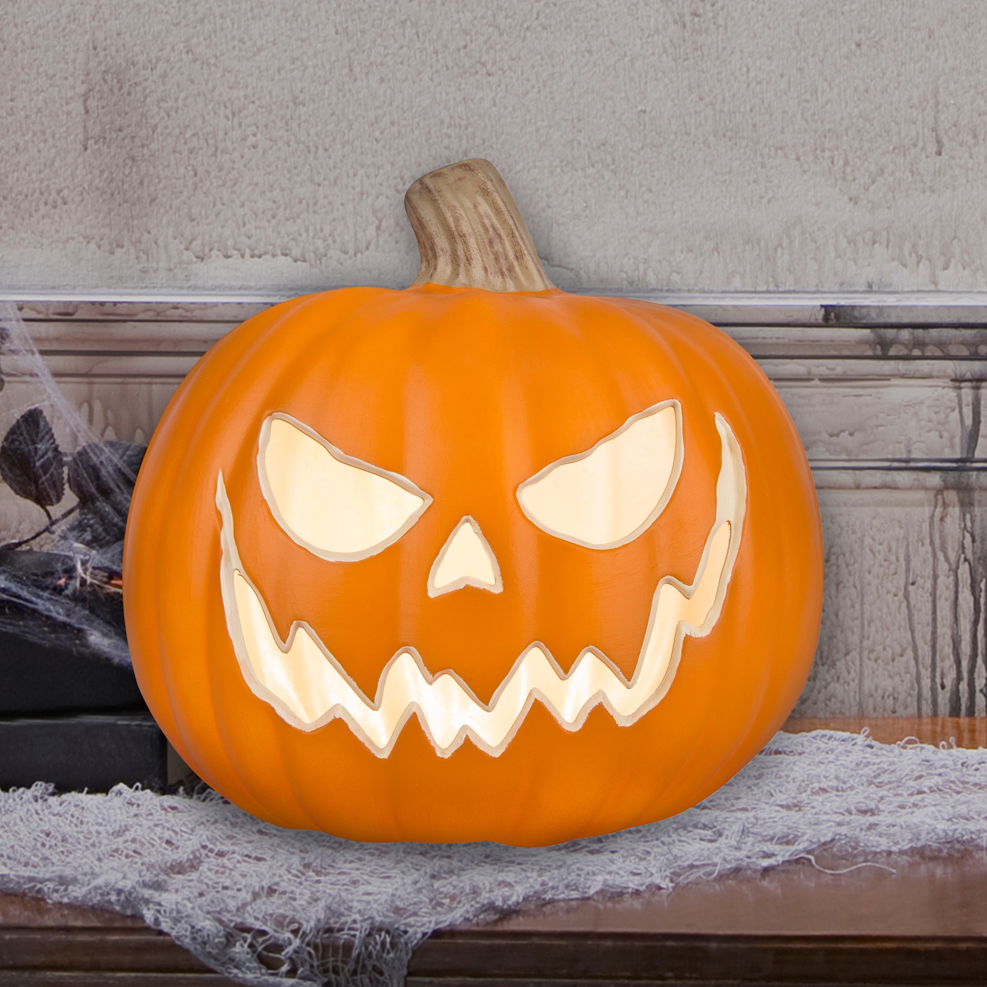 LIGHTED PUMPKIN DECOR: Indoor lighted jack-o'-lantern with creepy face and orange finish. LIGHTS UP: Interior lights up with bright light. For indoor use.