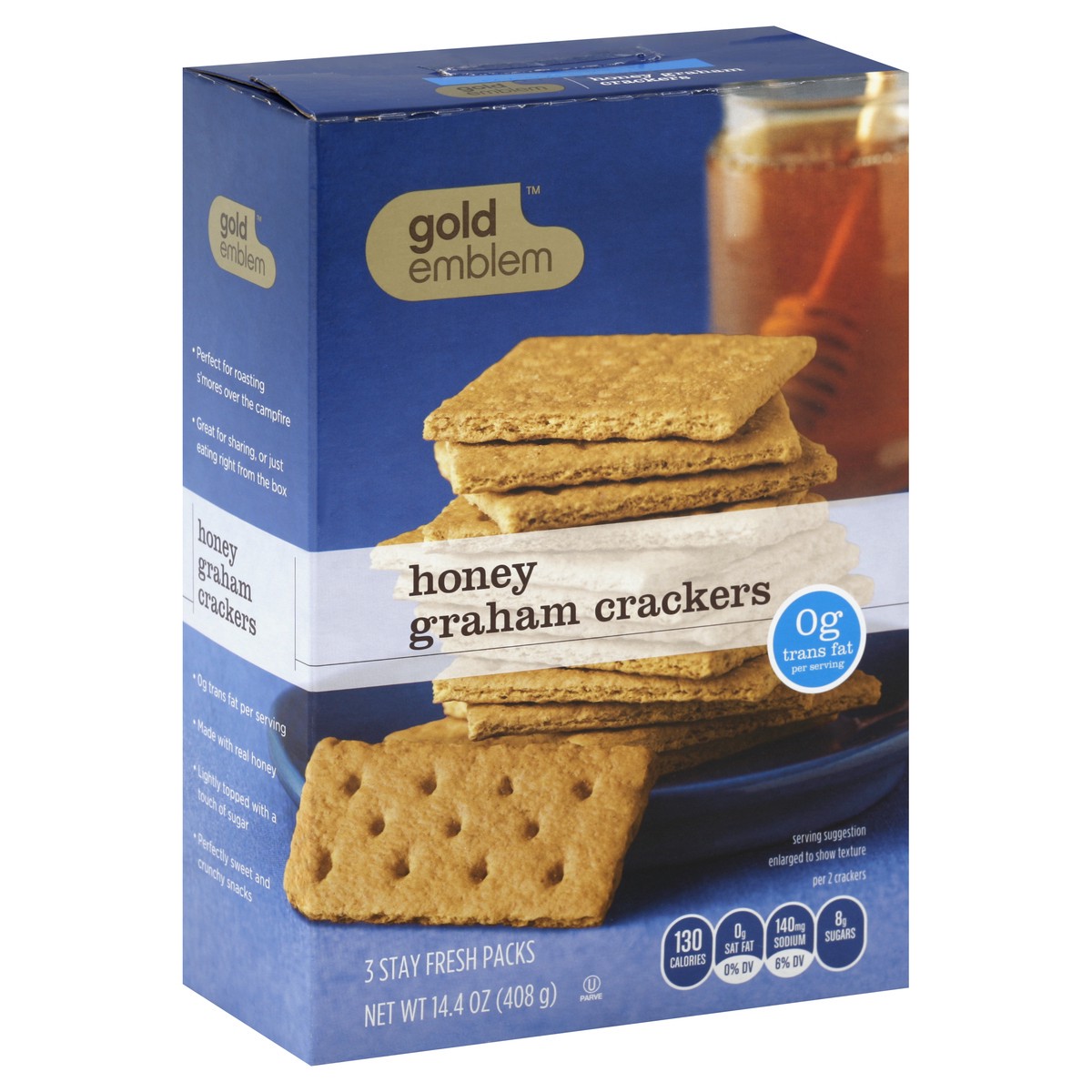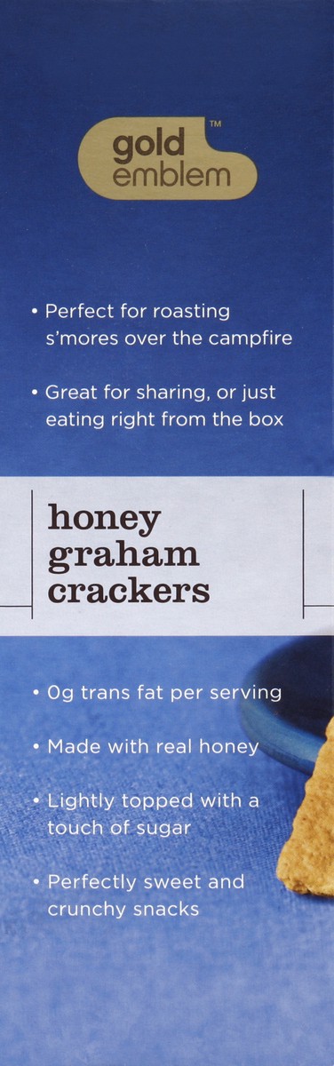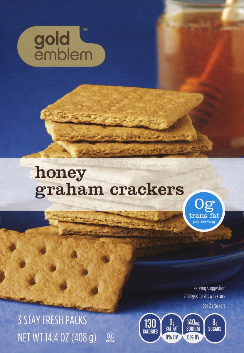 3 stay fresh packs. 0 g trans fat per serving. Per 2 Crackers: 130 calories; 0 g sat fat (0% DV); 140 mg sodium (6% DV); 8 g sugars. Gold Emblem Honey Graham Crackers are bursting with traditional gra…