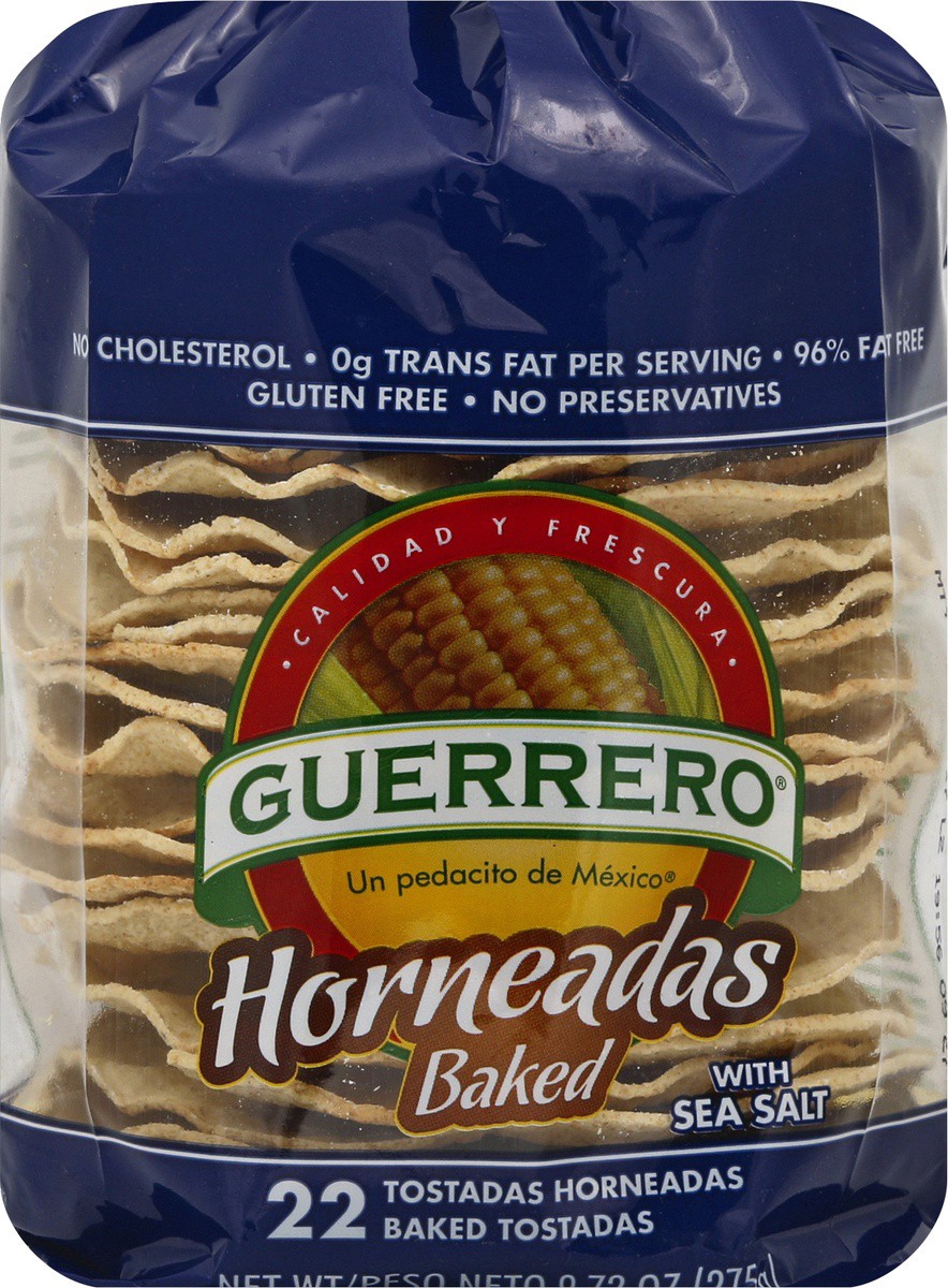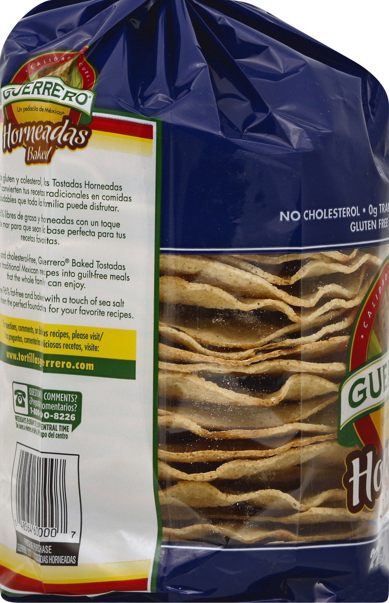 No cholesterol. 0 g trans fat per serving. 96% fat free. Gluten free. No preservatives. Gluten and cholesterol-free, Guerrero Baked Tostadas turn your traditional Mexican recipes into guilt-free meals…