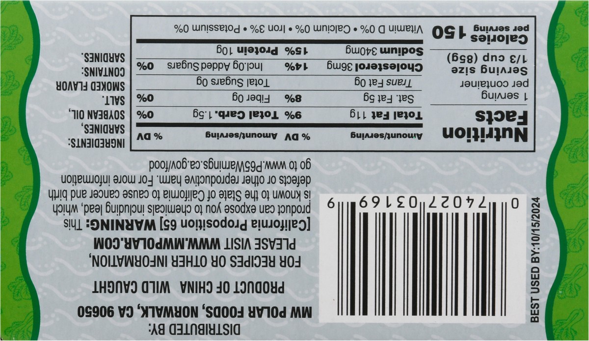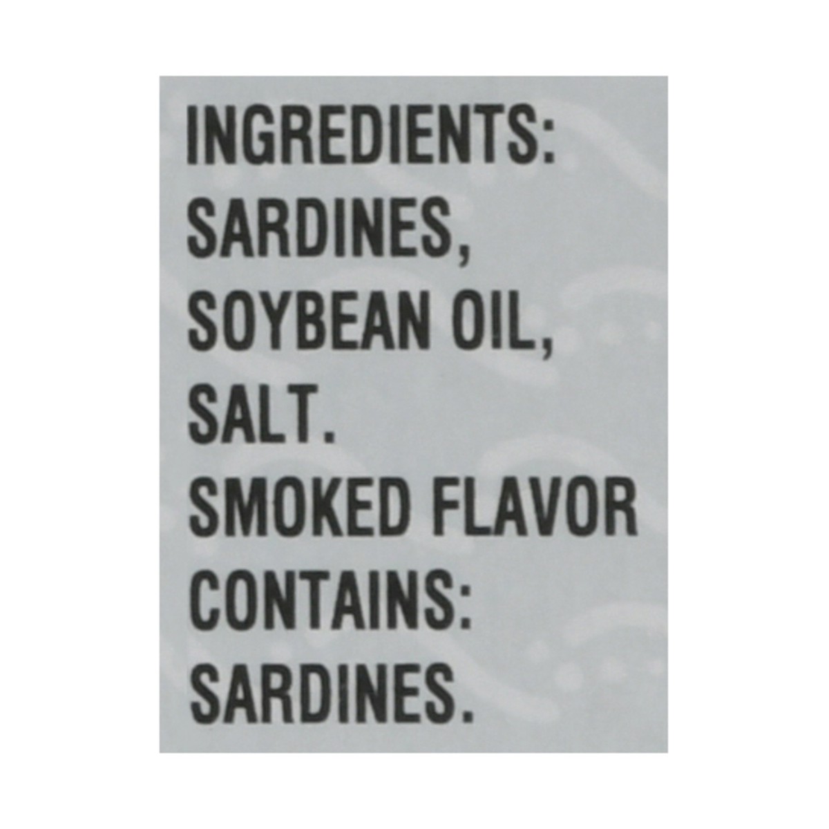 Sardines, Soybean Oil, Salt, Smoked Flavor.