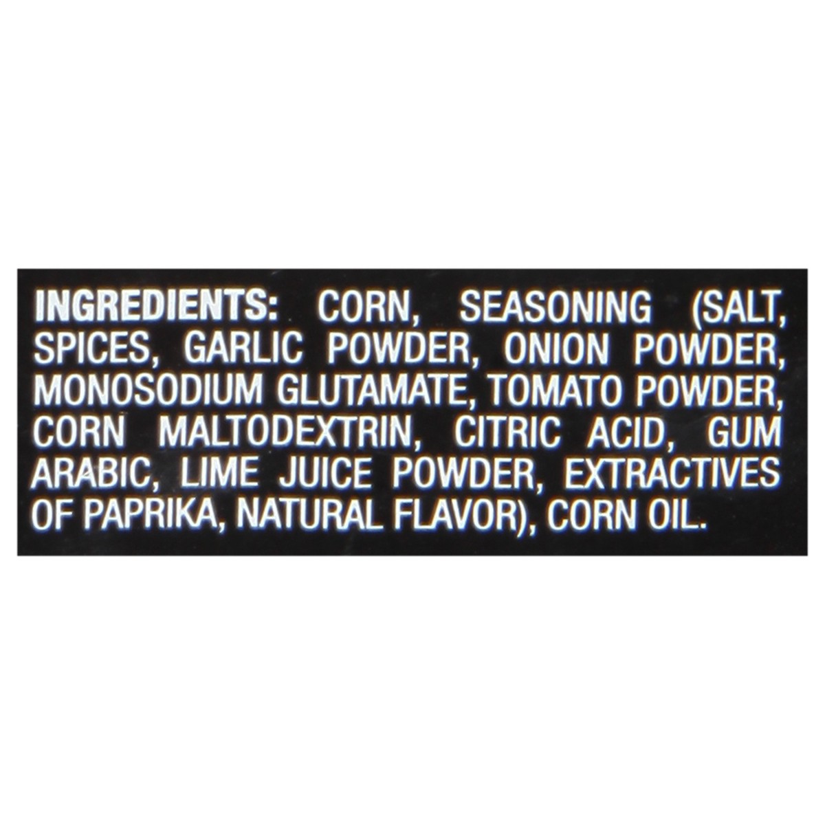 Corn, Seasoning (Salt, Spices, Garlic Powder, Onion Powder, Monosodium Glutamate, Tomato Powder, Corn Maltodextrin, Citric Acid, Gum Arabic, Lime Juice Powder, Extractives of Paprika, Natural Flavor),…