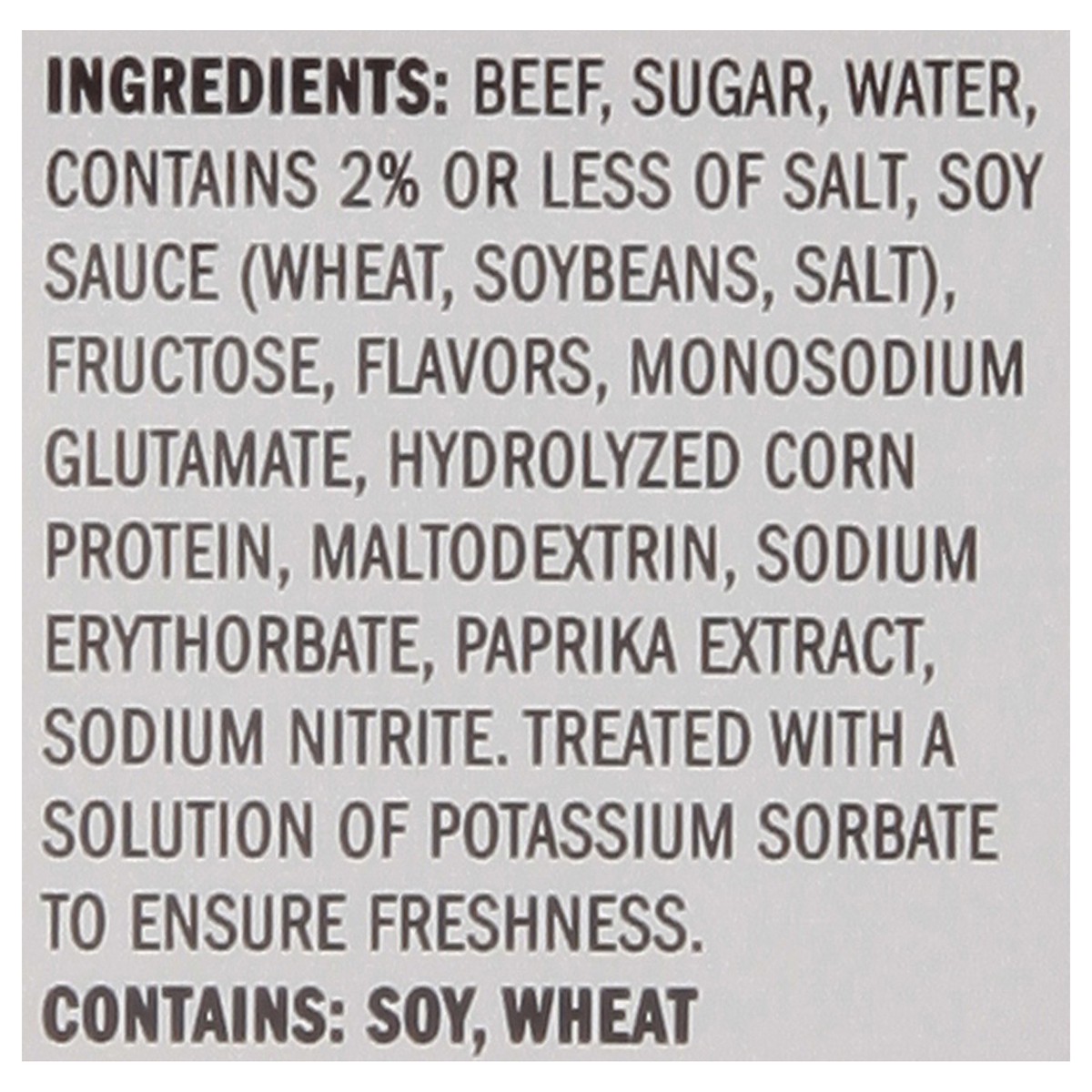 Beef, Sugar, Water, Contains 2% or Less of Salt, Soy Sauce (Wheat, Soybeans, Salt), Fructose, Flavors, Monosodium Glutamate, Hydrolyzed Corn Protein, Maltodextrin, Sodium Erythorbate, Paprika Extract,…