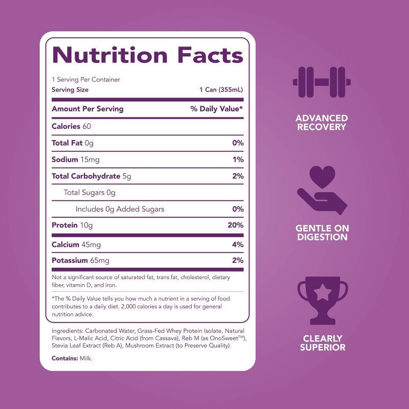 ingredients: carbonated water, grass-fed whey protein isolate, natural flavors, l-malic acid, citric acid (from cassava), reb m (as onosweet™), stevia leaf extract (reb a), mushroom extract (to preser…