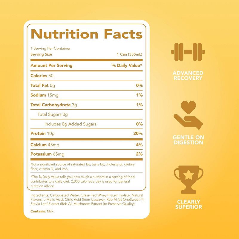 Carbonated Water, Grass-Fed Whey Protein Isolate, Natural Flavors, L-Malic Acid, Citric Acid (from Cassava), Reb M (as OnoSweet), Stevia Leaf Extract (Reb A), Mushroom Extract (to Preserve Quality).