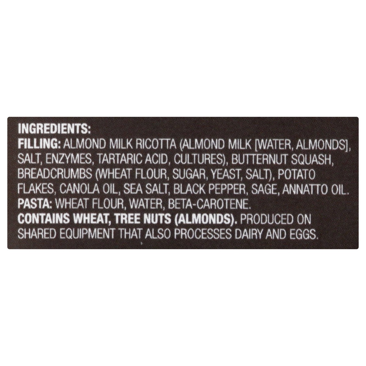 Filling: Almond Milk Ricotta (Almond Milk (Water, Almonds), Salt, Enzymes, Tartaric Acid, Cultures), Butternut Squash, Breadcrumbs (Wheat Flour, Sugar, Yeast, Salt), Potato Flakes, Canola Oil, Sea Sal…