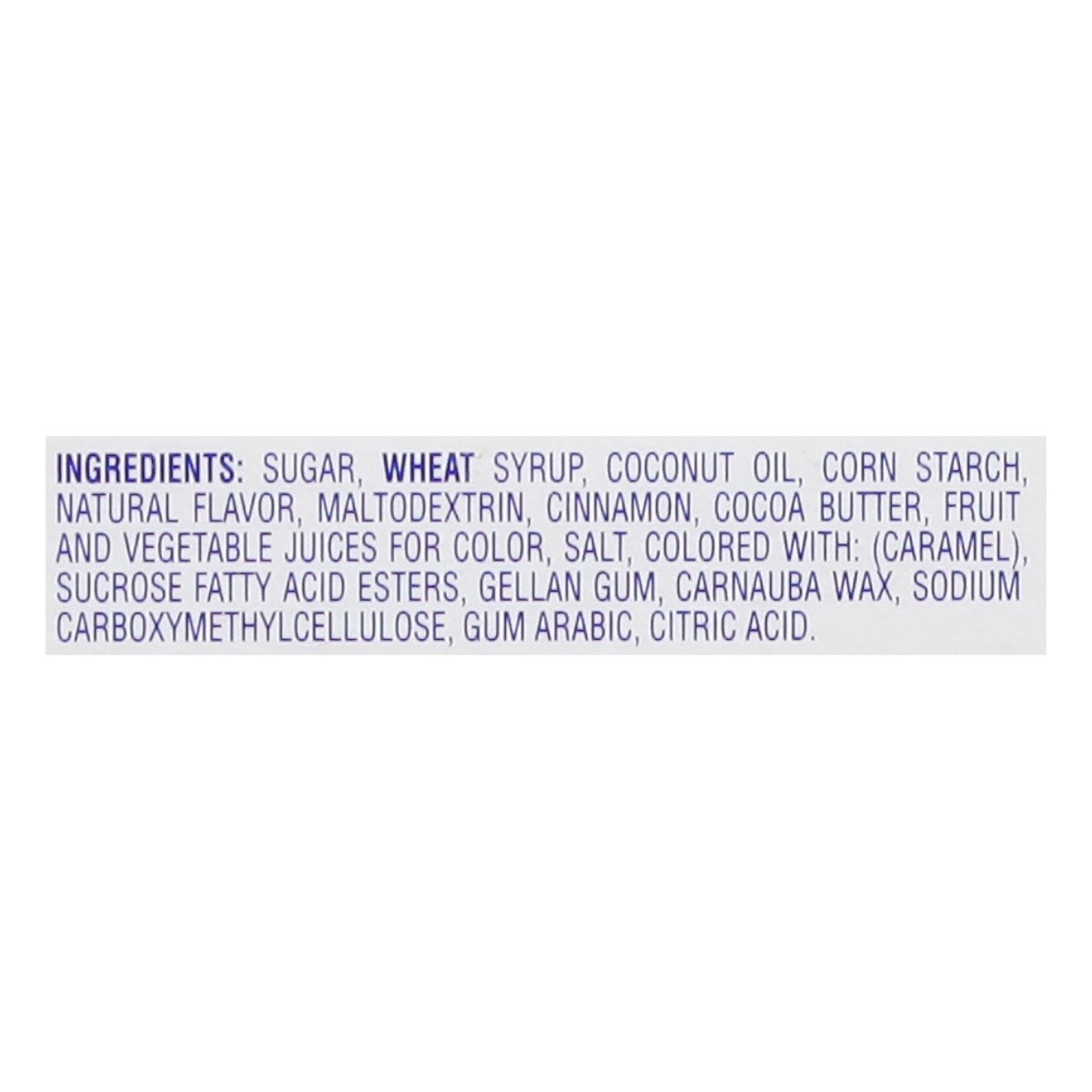 Sugar, Wheat Syrup, Coconut Oil, Corn Starch, Natural Flavor, Maltodextrin, Cinnamon, Cocoa Butter, Fruit and Vegetable Juices for Color, Salt, Colored with: (Caramel), Sucrose Fatty Acid Esters, Gell…