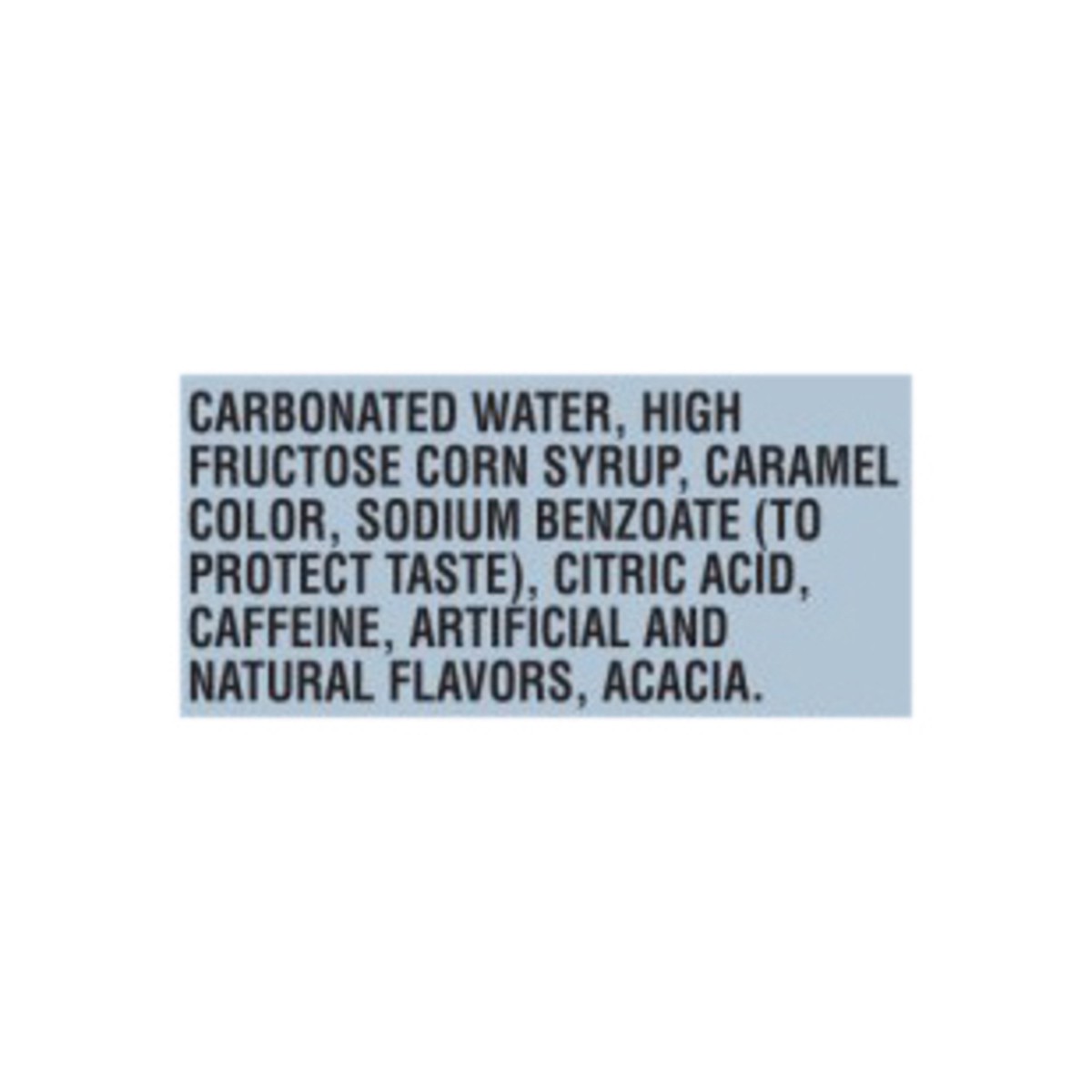 Carbonated Water, High Fructose Corn Syrup, Caramel Color, Sodium Benzoate (To Protect Taste), Citric Acid, Caffeine, Artificial And Natural Flavors, Acacia.