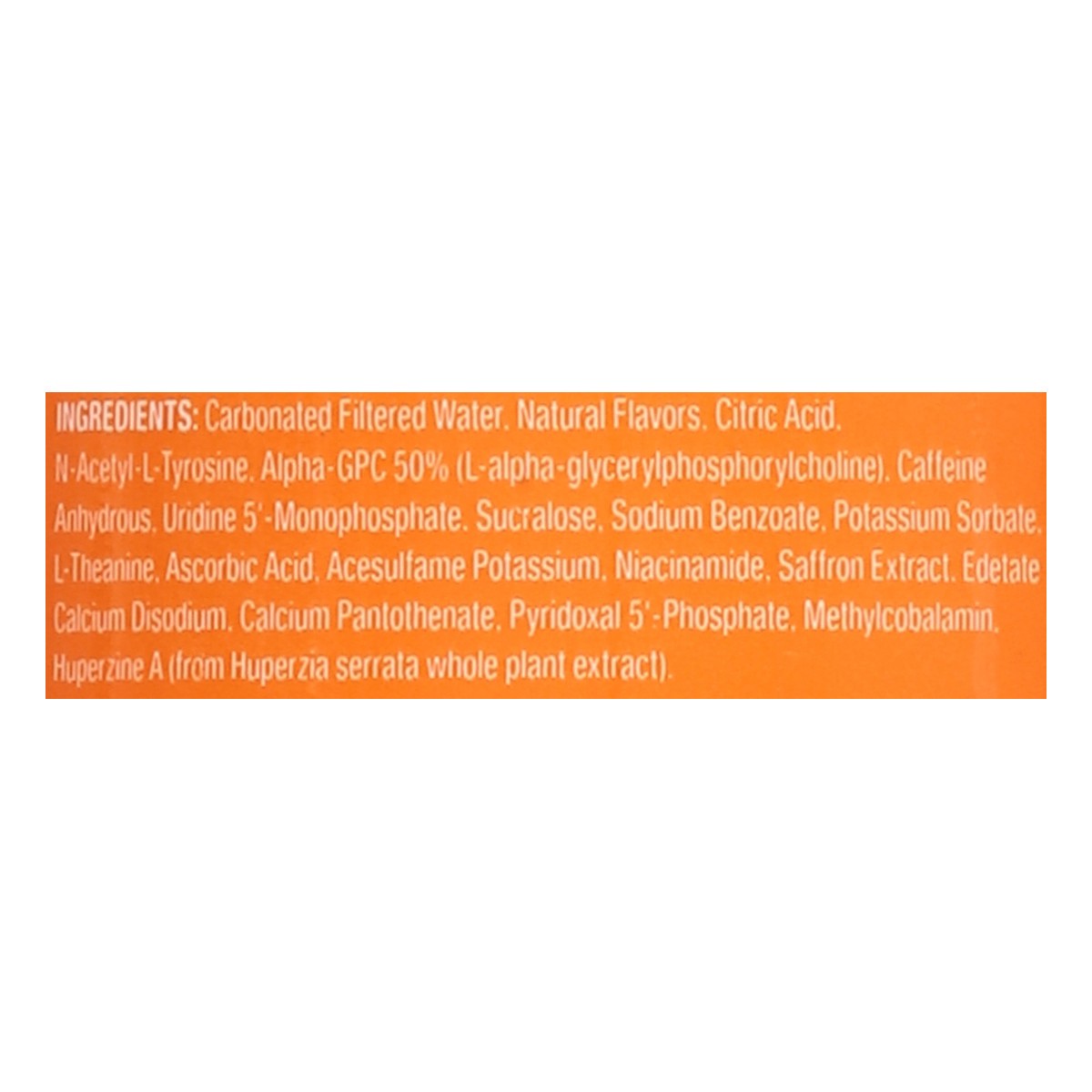 Carbonated Filtered Water, Natural Flavors, Citric Acid, N-Acetyl-L-Tyrosine, Alpha-GPC 50% (L-Alpha-Glycerylphosphorylcholine), Caffeine Anhydrous, Uridine 5''-Monophosphate, Sucralose, Sodium Benzoa…