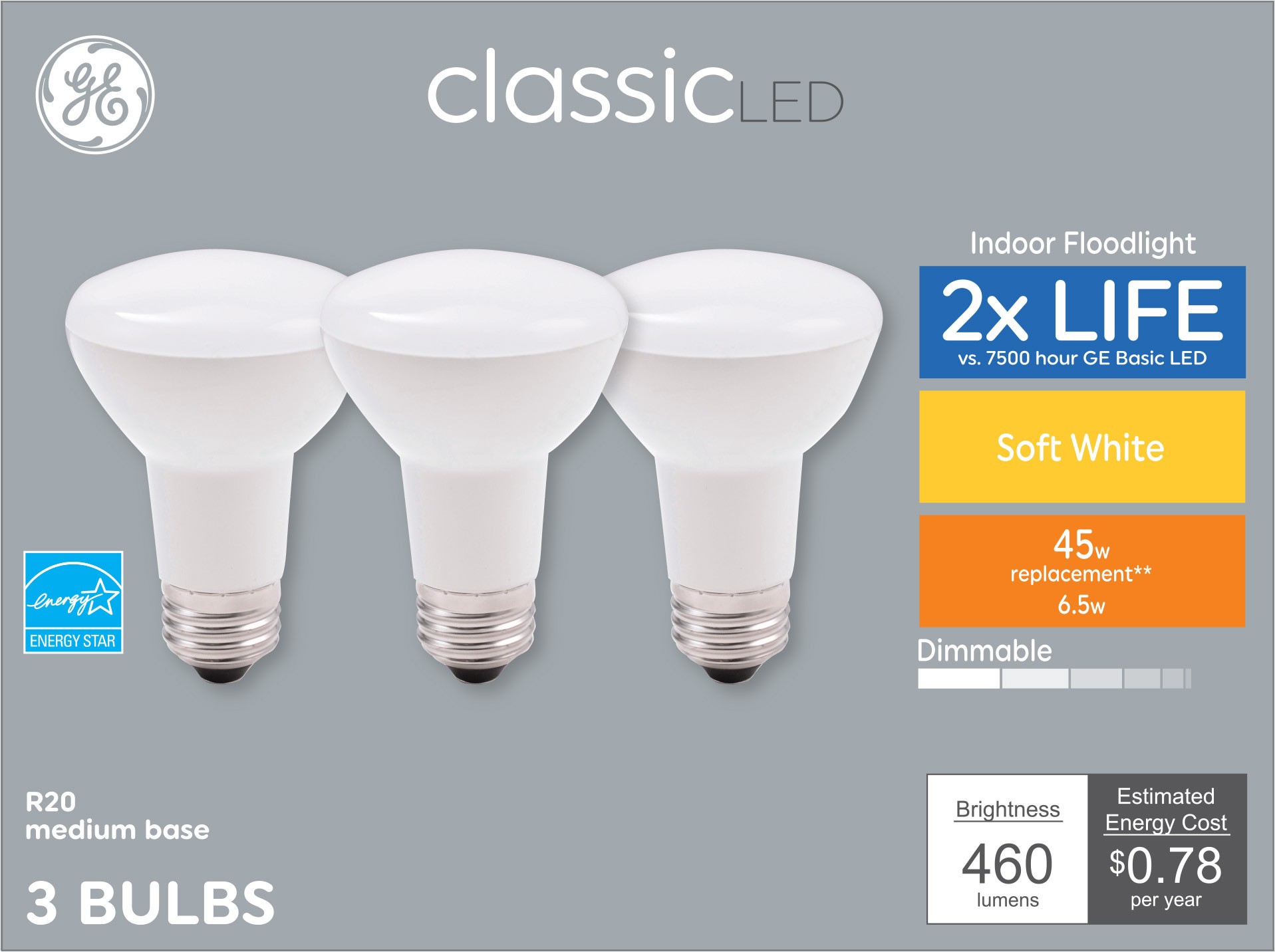 45-Watt replacement using only 6.5 Watts (460 lumens). Rated to last 13 years based on 3 hours per day use. Saves 63 dollars on energy costs per bulb versus 45-Watt incandescent over the bulb's life. …