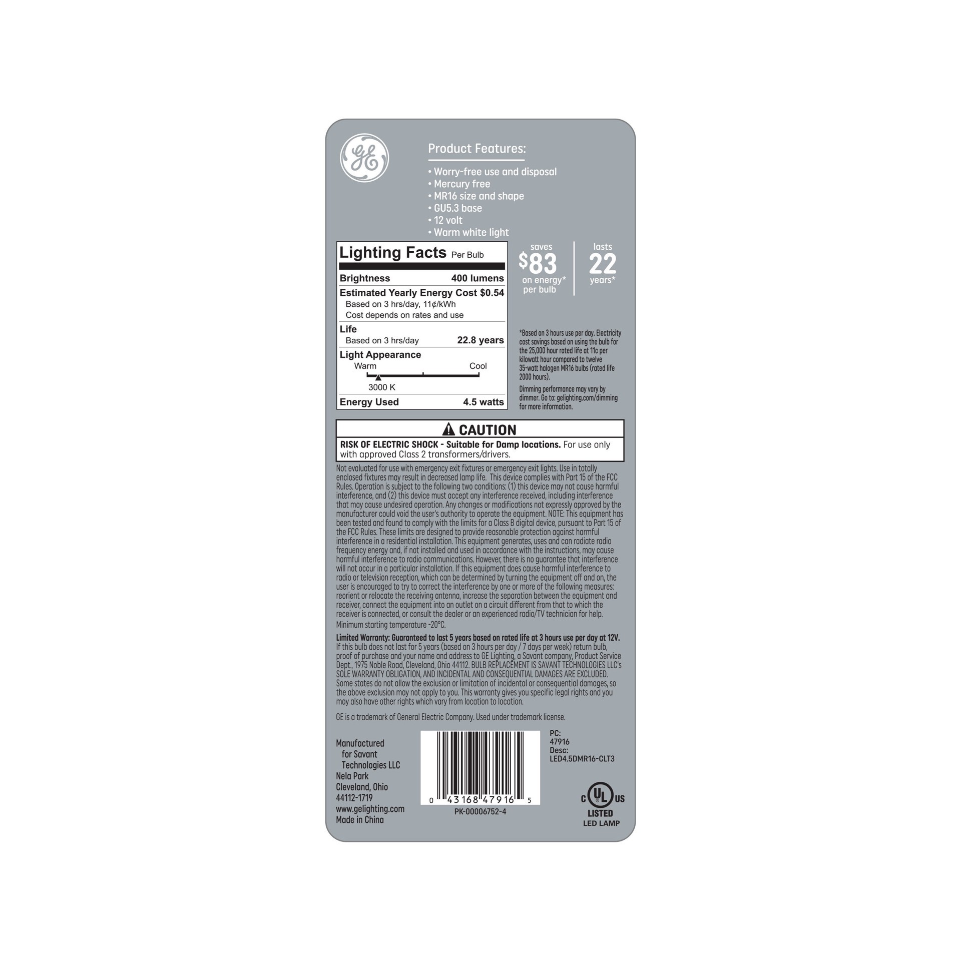 35 Watt replacement using only 4.5 Watts (400 lumens). Rated to last 22 years based on 3 hours per day use. Saves 83 dollars on energy costs per bulb vs 35-Watt MR16 halogen over the bulb's life. Dimm…