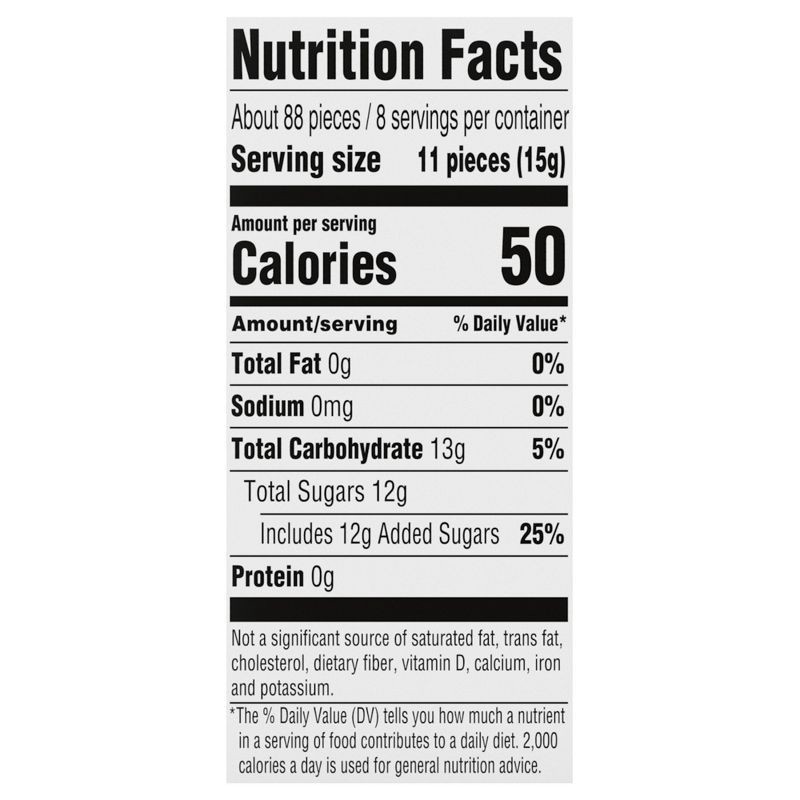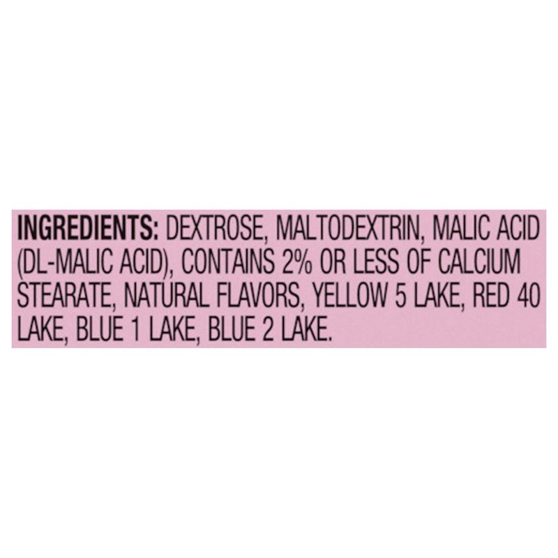 Dextrose, Maltodextrin, Malic Acid (DL-Malic Acid), Contains 2% or Less of Calcium Stearate, Natural Flavors, Yellow 5 Lake, Red 40 Lake, Blue 1 Lake, Blue 2 Lake.