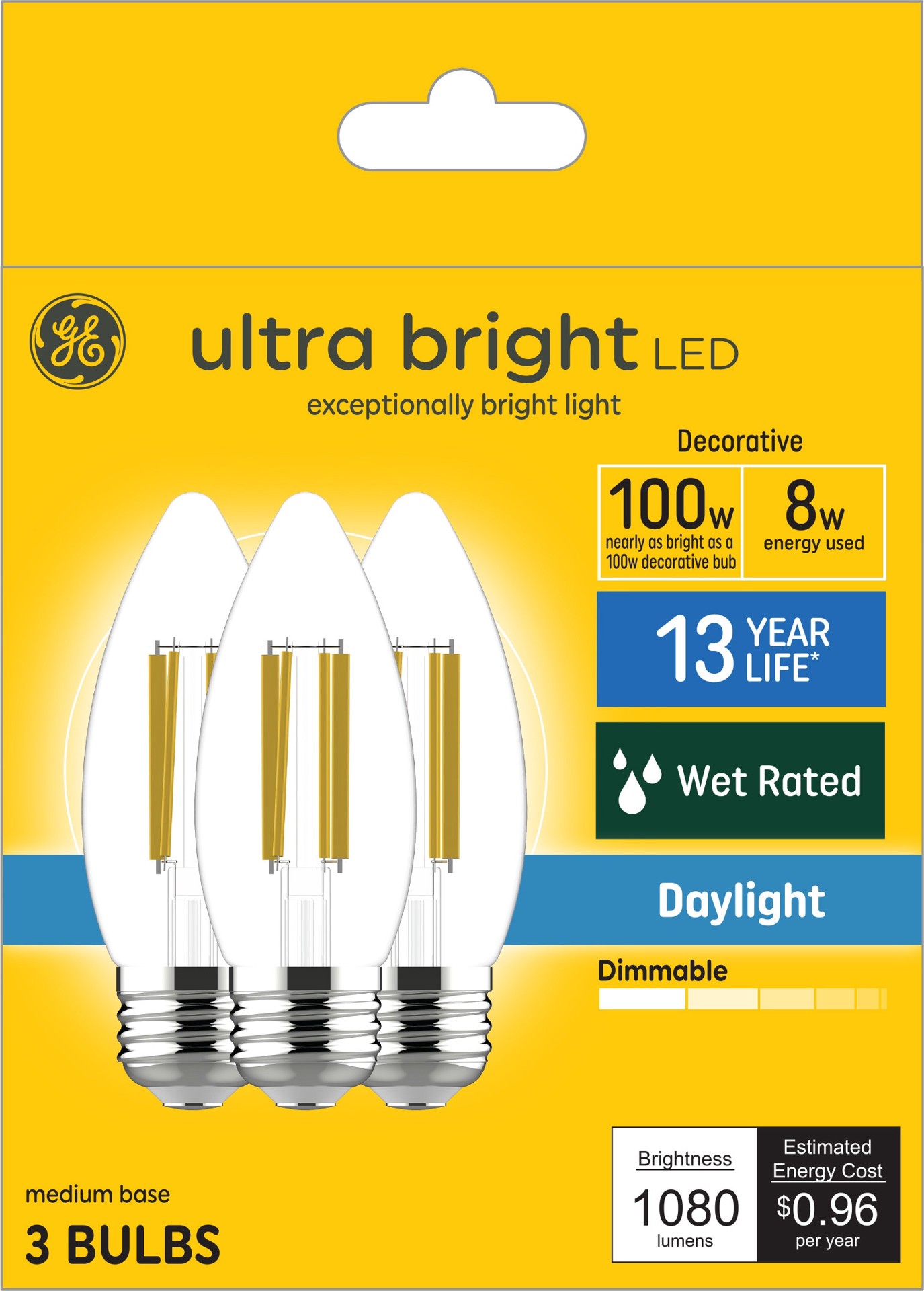 100 watt replacement using only 8 watts (1080 lumens). Rated to last 13 years based on 3 hours per day use. Each bulb costs 0.96 dollars annually to operate based on 3 hours per day use at 11 cents pe…