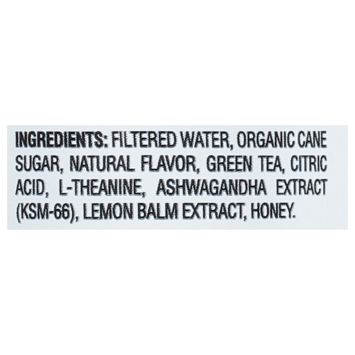 Filtered Water, Organic Cane Sugar, Natural Flavor, Green Tea, Citric Acid, L-Theanine, Ashwagandha Extract (KSM-66), Lemon Balm Extract, Honey.