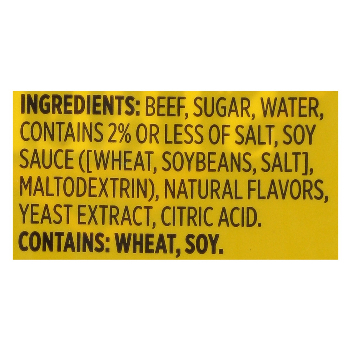 Beef, Sugar, Water, Contains 2% or Less of Salt, Soy Sauce ([Wheat, Soybeans, Salt], Maltodextrin), Natural Flavors, Yeast Extract, Citric Acid.