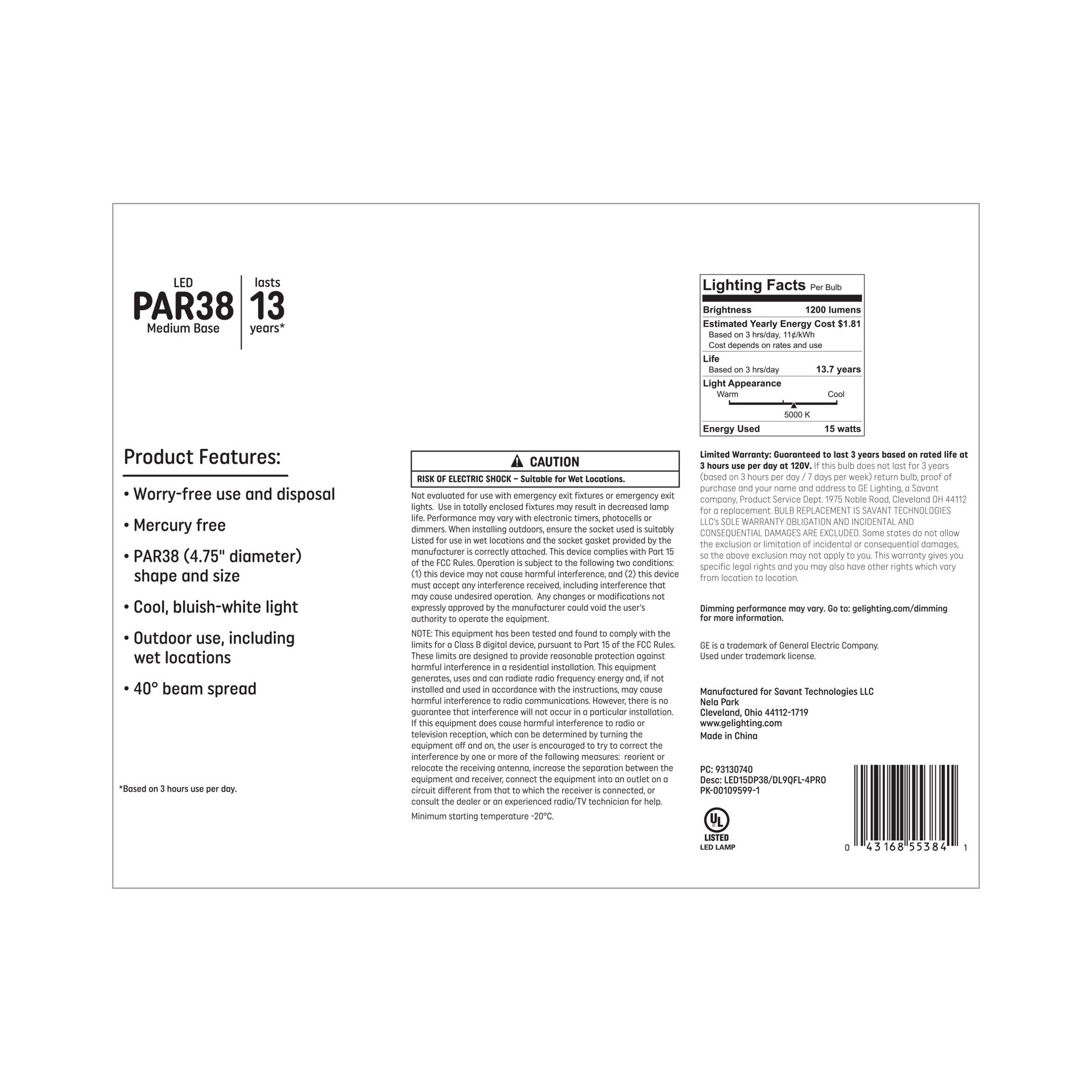 90 Watt replacement using only 15 Watts (1200 lumens). Rated to last 13 years based on 3 hours per day use. Dimmable and works with most dimmer switches. Cool, blueish white daylight - 5000 Kelvin col…