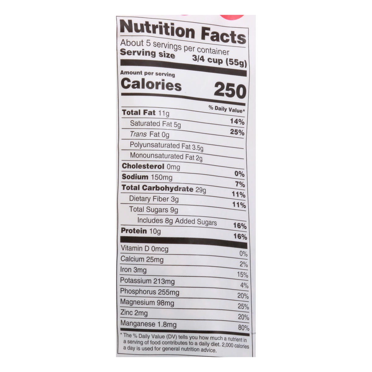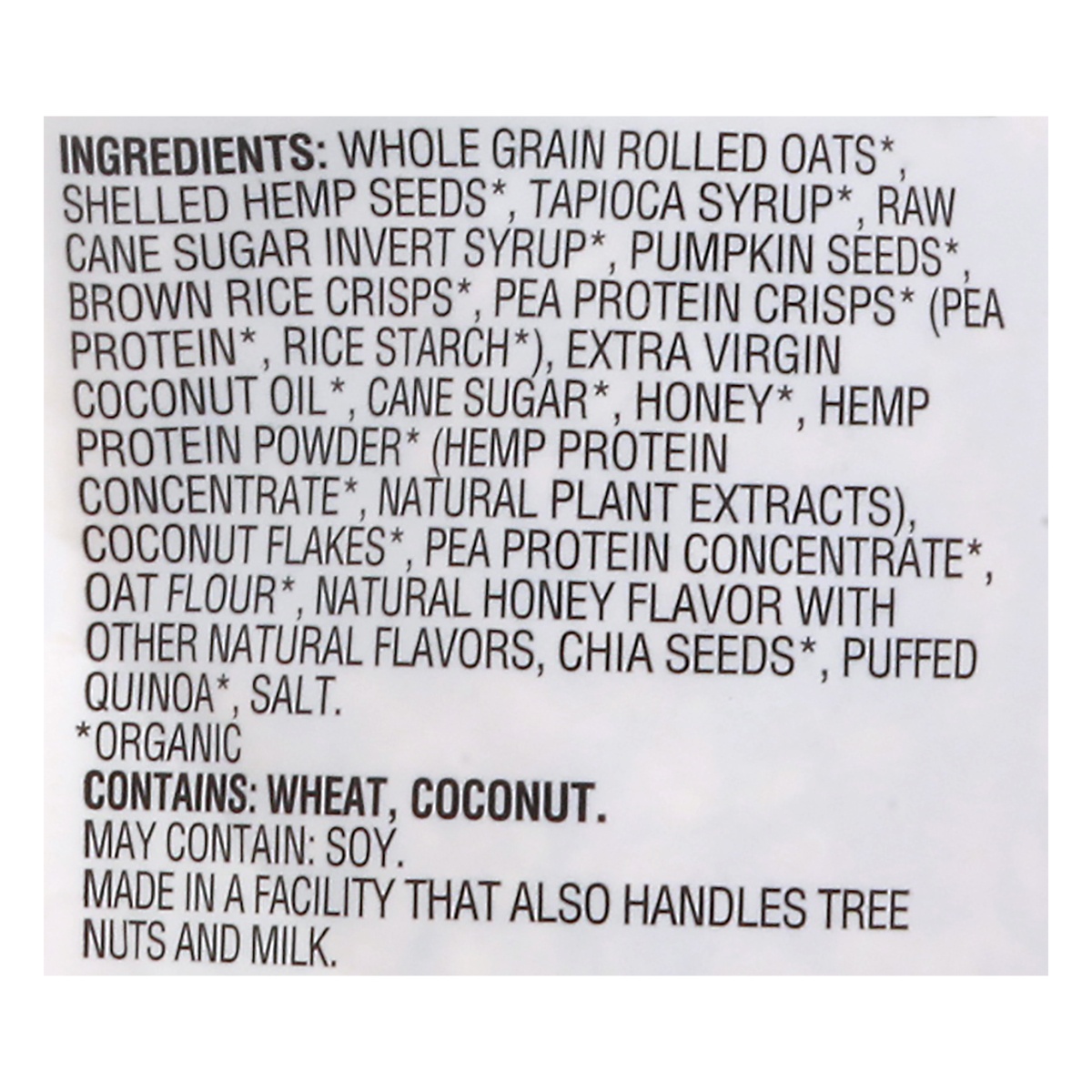 Whole Grain Rolled Oats (Organic), Shelled Hemp Seeds (Organic), Tapioca Syrup (Organic), Raw Cane Sugar Invert Syrup (Organic), Pumpkin Seeds (Organic), Brown Rice Crisps (Organic), Pea Protein Crisp…