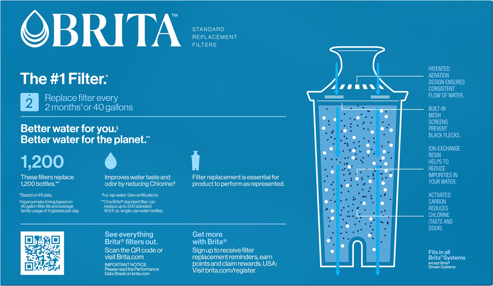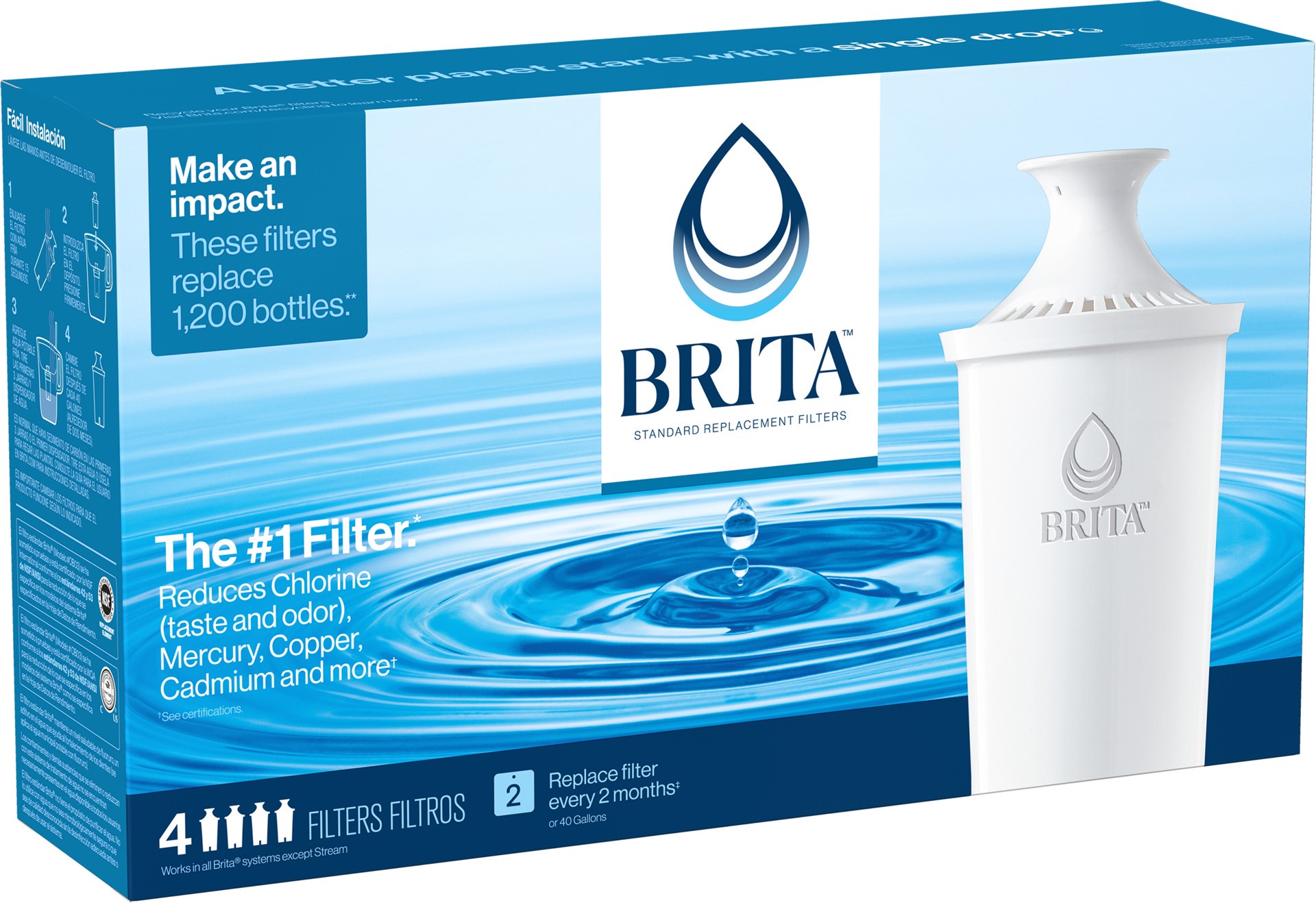 Drink healthier, great-tasting tap water with the Brita Standard Water Filter. This BPA-free Brita water filter cuts the taste and odor of chlorine, plus it reduces copper, cadmium and mercury impurit…