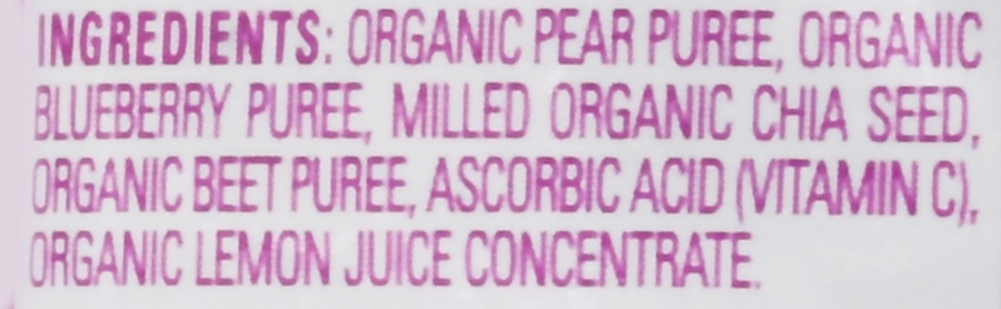 Organic Pear Puree, Organic Beet Puree, Organic Blueberry Puree, Milled Organic Chia Seeds, Less than 1.5% of: Organic Lemon Juice Concentrate, Ascorbic Acid (Vitamin C).