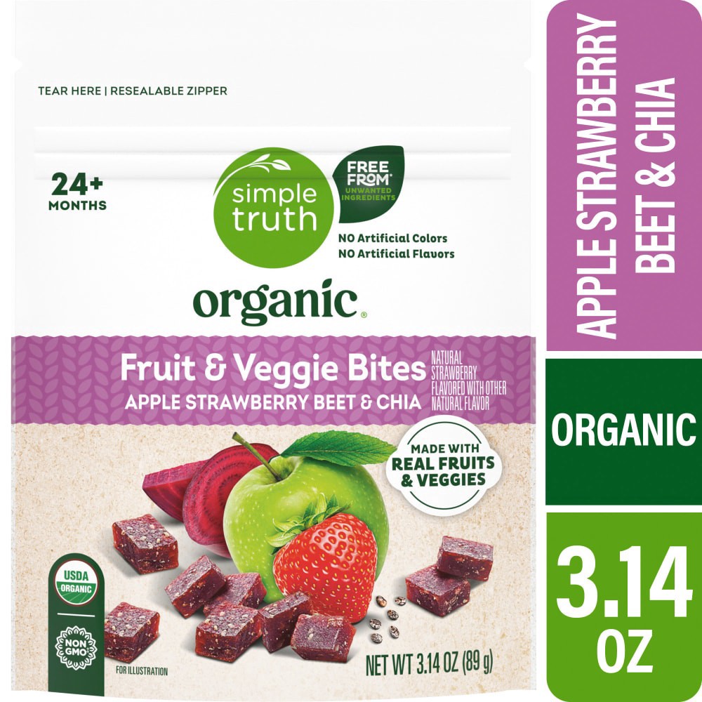 Simple Truth Organic® Apple Strawberry Beet and Chia Fruit and Veggie Bites make feeding your little one quick and simple. With USDA organic and non-GMO ingredients and made with real fruits and veggi…