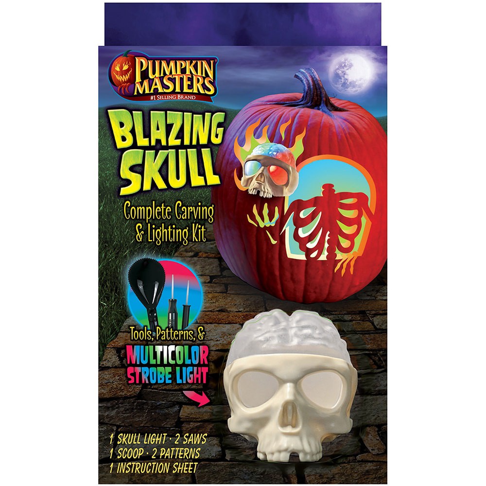 Pumpkin Masters® Blazing Skull Complete Carving & Lighting Kit features a new technique of lighting both the inside and outside of the pumpkin, creating a cool 3D effect.New technique for pumpkin carv…