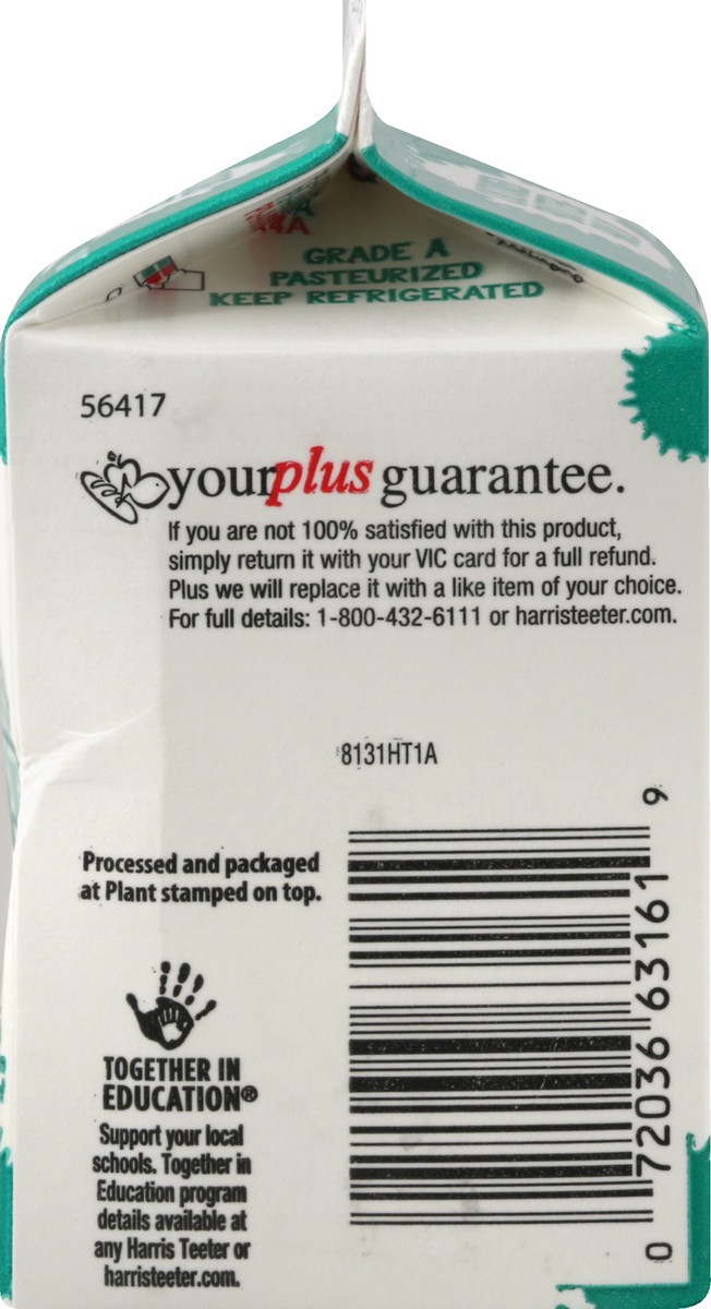 110 calories per 1 cup. Low Fat. Pasteurized. Processes and packaged at plant stamped on top. Yourplus guarantee. Grade A. harristeeter.com. Together in Education: Support your local schools. Together…